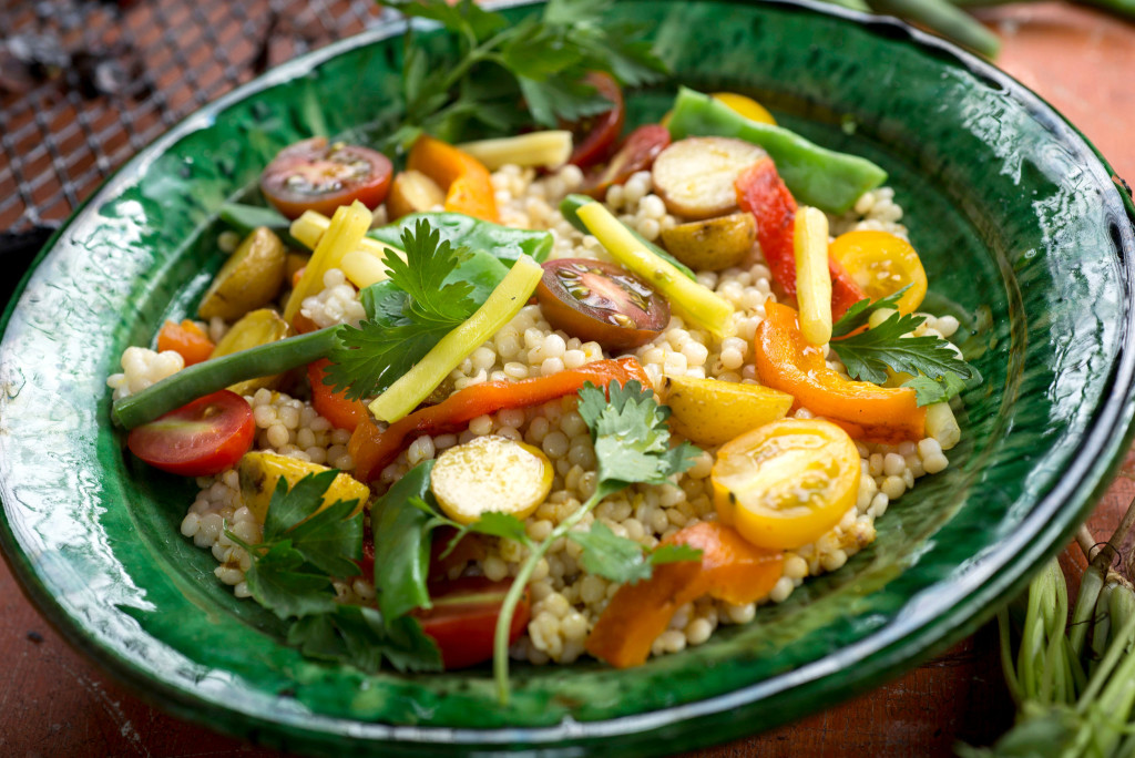 - Put couscous in a shallow salad bowl. Add roasted peppers, cherry tomatoes and beans and season with salt and pepper. Add dressing and toss well to coat. Add potatoes and toss again. Taste and adjust for salt and lemon. Garnish with mint, cilantro or parsley leaves.