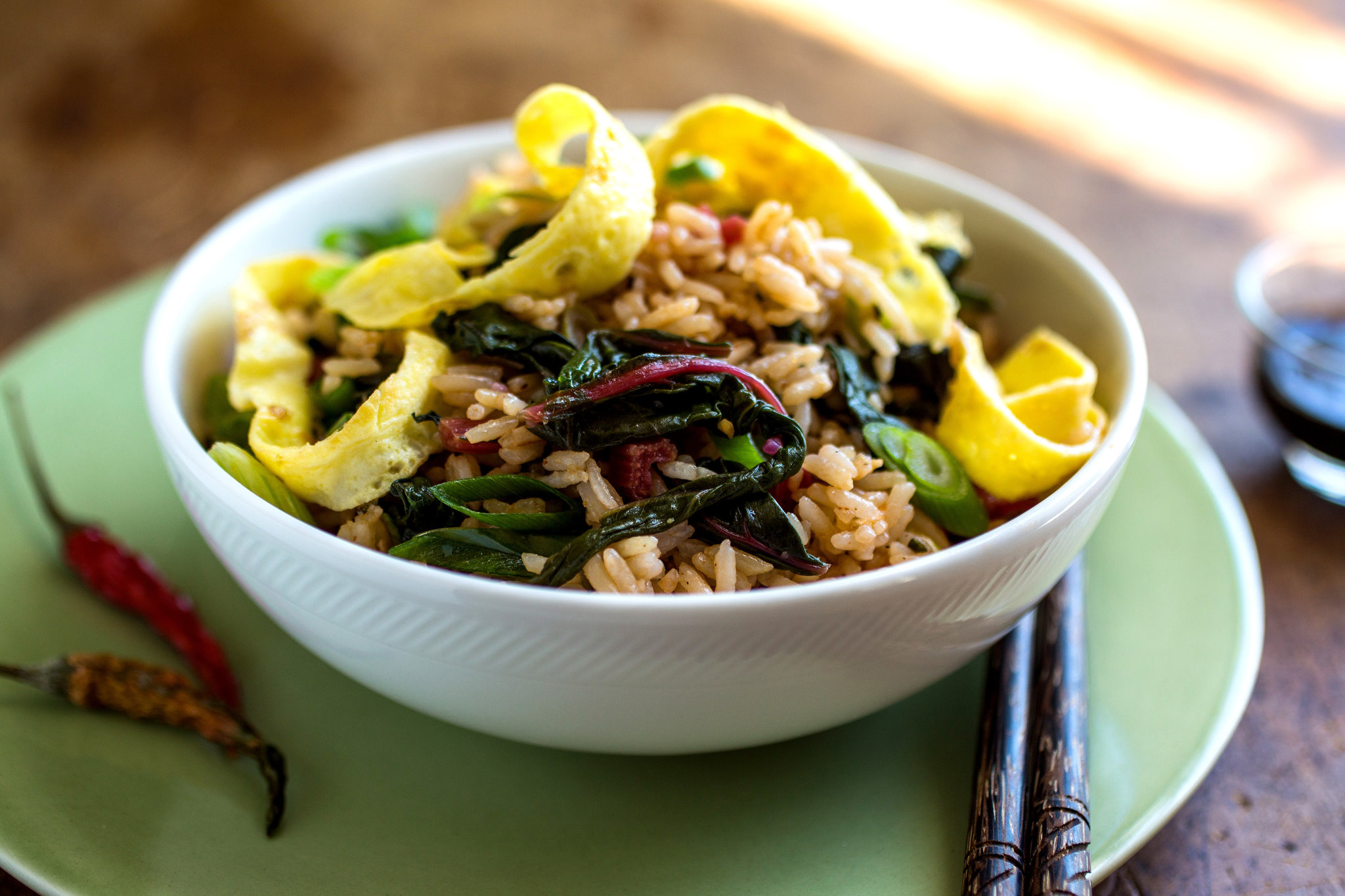 - Swirl remaining oil into wok or pan and add garlic and ginger. Stir-fry no more than 10 secods, and add amaranth or chard, and white parts of the scallions. Stir-fry for 2 minutes and add Thai basil; stir together for a few seconds, then add rice. Stir-fry, scooping up the rice with your spatula, then pressing it into the hot wok and scooping it up again, for about 2 minutes. The rice should sear and stick to the sides of the wok. Add soy sauce, sriracha, pepper, green part of the scallions, and eggs and cilantro, stir for about 30 seconds, scraping the rice off the sides of the wok as it sticks. Remove from the heat. Serve hot.