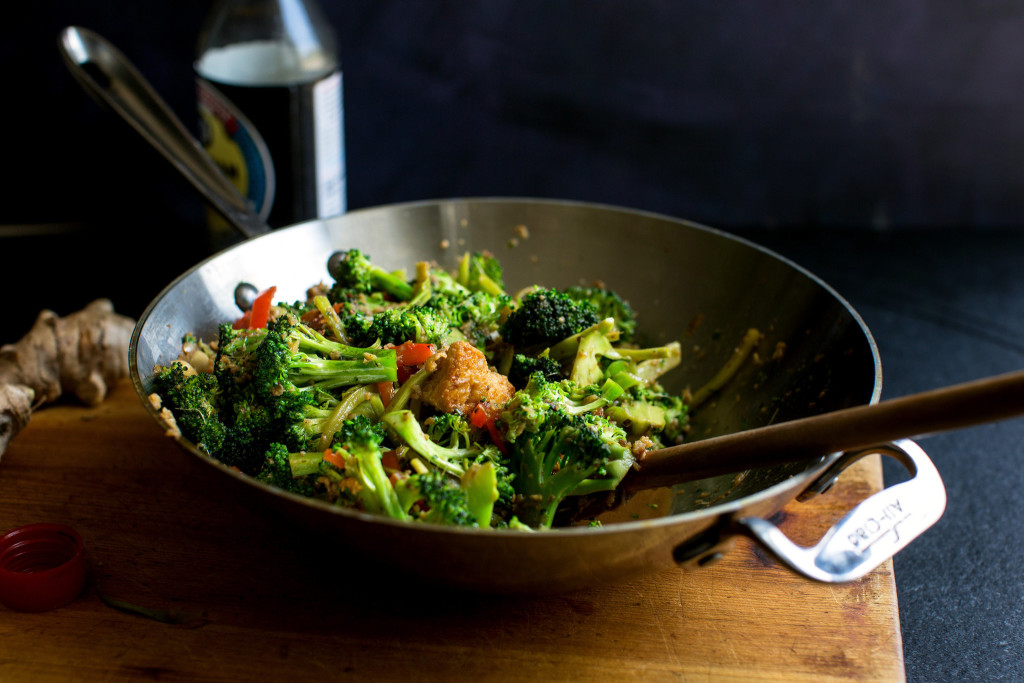 4. Swirl in remaining oil, add garlic, ginger and pepper flakes if using and stir-fry for no more than 10 seconds. Add peanuts, all of the broccoli – stems, crowns and flower buds – and red peppers, and stir-fry for 1 minute. Add salt, pepper, and sugar, toss together and add soy sauce mixture. Stir-fry for 1 to 2 minutes, until vegetables are crisp-tender, and return tofu to the wok. Add cilantro and stir together for about 30 seconds. Serve with additional soy sauce as desired and hot grains or noodles.