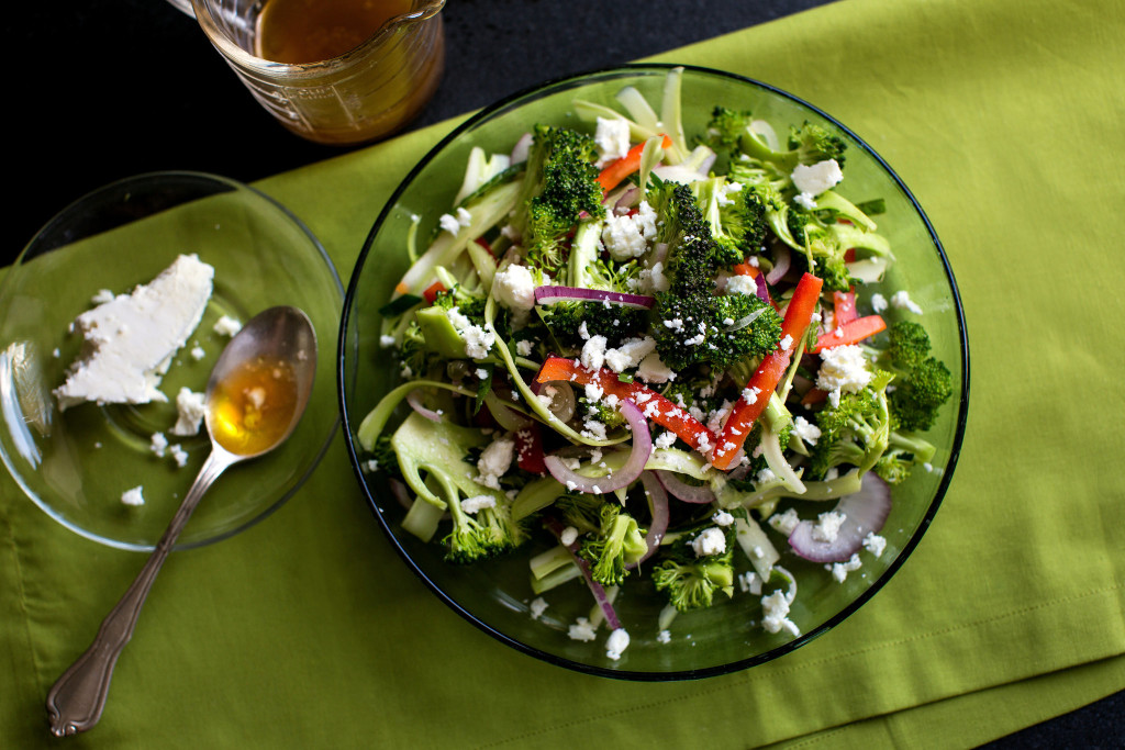 - Meanwhile, cut broccoli stems away from the crowns and peel. Cut in half and lay on the flat side on your cutting surface. Using a vegetable peeler, shave thin ribbons off the stalks. Place in a bowl. Cut crowns in half and lay flat on your cutting board. Using a chef’s knife, shave off the flower buds and slice paper thin where the stems and florets are attached. Add to the bowl with the stems. Add onion and red pepper or beets. Season to taste with salt and pepper. Add herbs and feta.