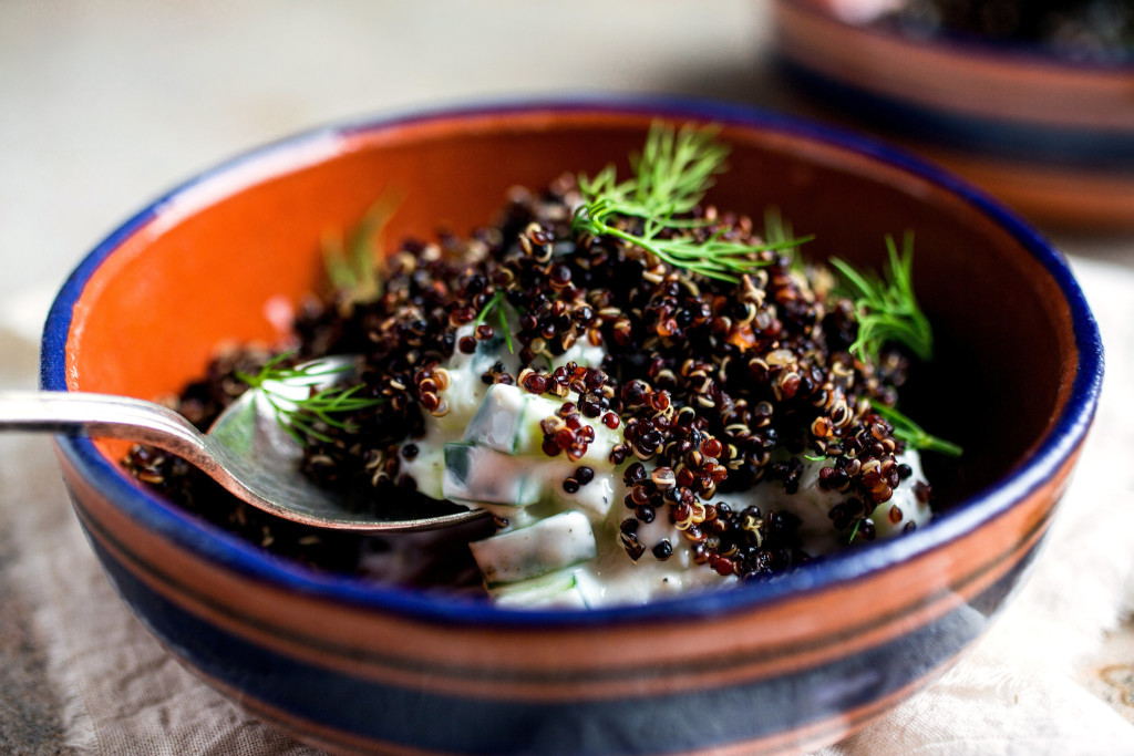 The idea of embellishing a yogurt soup or salad with quinoa comes from Deborah Madison, who uses black quinoa in a brilliant recipe for a soup in her book “Vegetable Literacy.” I used red quinoa to add texture, color and substance to this typical Mediterranean combination – finely diced cucumber, garlic, and thick plain yogurt. Use mint or dill, or a combination, and make sure to dice the cucumber very small.