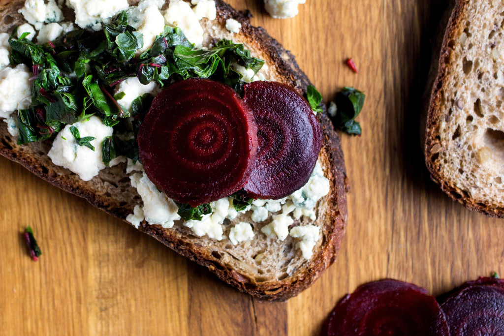 - Toss greens with herbs if desired. Spoon over cheese and press down onto the bread. Drizzle on 1/4 teaspoon olive oil. Arrange beet slices over the greens. If desired, add a little more cheese: either spread on the top slice of bread or sprinkle it over the beets. If desired, rub second piece of bread with the cut garlic clove before spreading with cheese. Place over beets and press down firmly. Drizzle remaining olive oil over the top slice.
