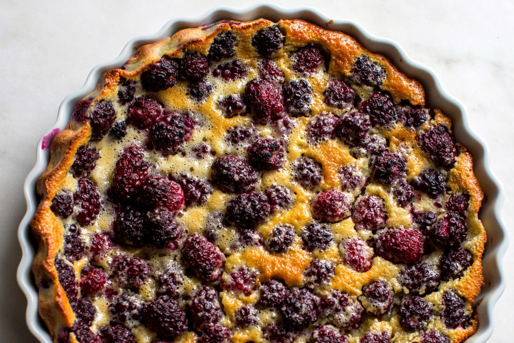 Clafoutis, as you may must know by now, are among my favorite vehicles for seasonal fruit. I love the way blueberries and blackberries bleed into the batter as this bakes. Let it cool for about a half- hour, or completely, before you serve it, and be careful when you cut into it, as the berries can splatter when they’re warm. My clafoutis are not very sweet, and I enjoy them for breakfast as well as for dessert.