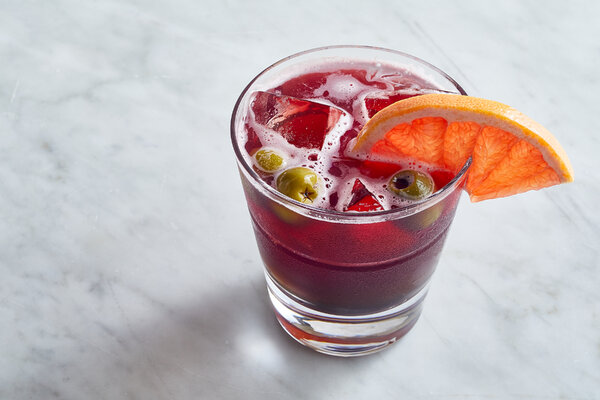 - Add the amaro and grapefruit juice to an ice-filled wine glass or lowball glass. Pour the Lambrusco and sparkling water over top. Stir gently, then add the grapefruit wedge. Add in the olives to taste. Serve immediately.