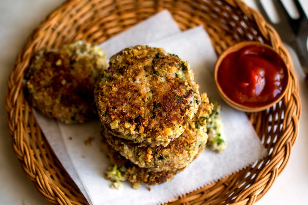 The famed vegetarian cookbook author Mollie Katzen has a whole chapter devoted to burgers and savory pancakes in her beautiful new cookbook, “The Heart of the Plate.” Before I’d looked carefully at the chapter I’d bought a bunch of broccoli with the idea that specks of broccoli would be beautiful in a burger. Mollie, with her delicious Walnut-Coated Broccoli-Speckled Mashed Potato Cakes, was way ahead of me on that idea. I loved her idea of coating the burgers with ground walnuts and barely cooking the finely chopped broccoli before incorporating it into the mix. I’ve made a variation on Mollie’s burgers, using red potatoes and sticking with the Indian seasonings I’ve been using in other burgers this week.