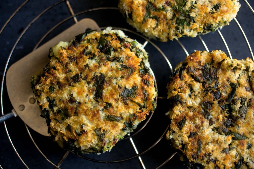 - Scoop out about 1/2 cup of the spinach-potato mixture, roll it with the palm of your hand to make a ball, and coat with panko or chickpea flour. Then press down to flatten to a 3 to 3 1/2-inch cake. Continue with remaining mixture. Chill for at least 1 hour.