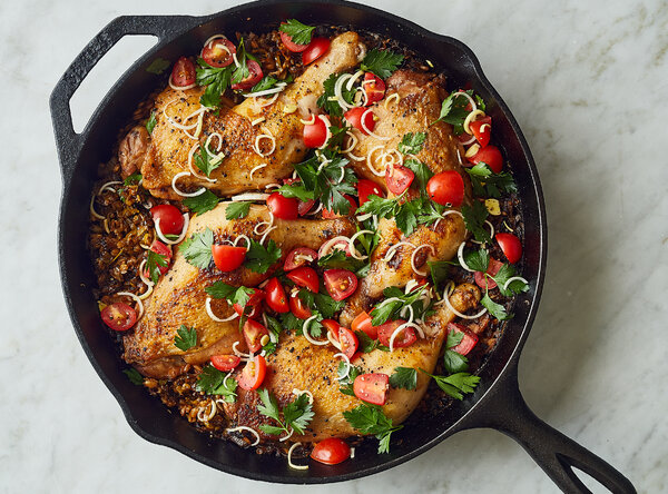 - Pour in chicken stock and bring to a simmer, scraping up the browned bits on the bottom of the pan. Stir in farro and 1 teaspoon salt. When the liquid comes to a simmer, reduce the heat to medium-low and nestle in the browned chicken, skin-side up; pour in any juices from the plate. Cover pan and let cook until the farro is tender and the chicken is cooked through, 25 to 30 minutes.