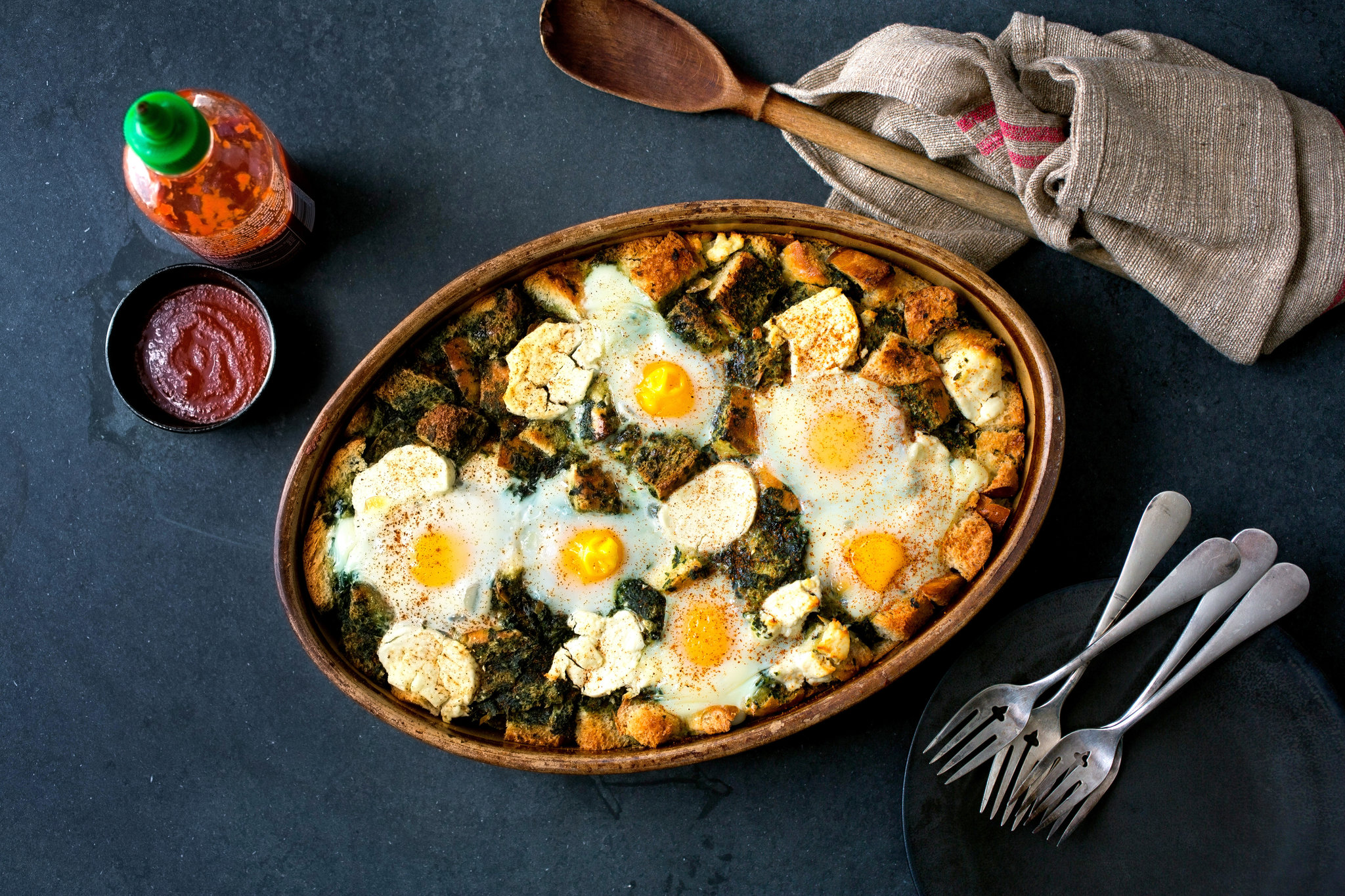 This herb-infused savory bread pudding makes an excellent brunch dish or a light dinner. It gets its hue from a copious amount of braising greens pureed into the custard — baby kale, mustard greens, chard. Use all of one or a combination. The bread cubes can soak for up to 24 hours before baking, so plan on assembling this in advance. But don’t bake it until just before serving. You want the eggs on top to still have their bright yellow, runny yolks. If you’re not a goat cheese fan, substitute dollops of fresh ricotta instead.
