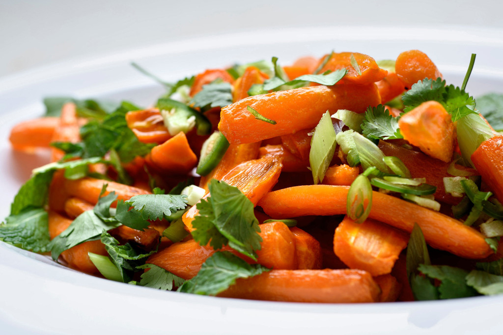 - Transfer hot carrots to a serving dish. Add jalapeño and mint and toss to distribute. Sprinkle with cilantro and squeeze lime juice over everything. Garnish with lime wedges.