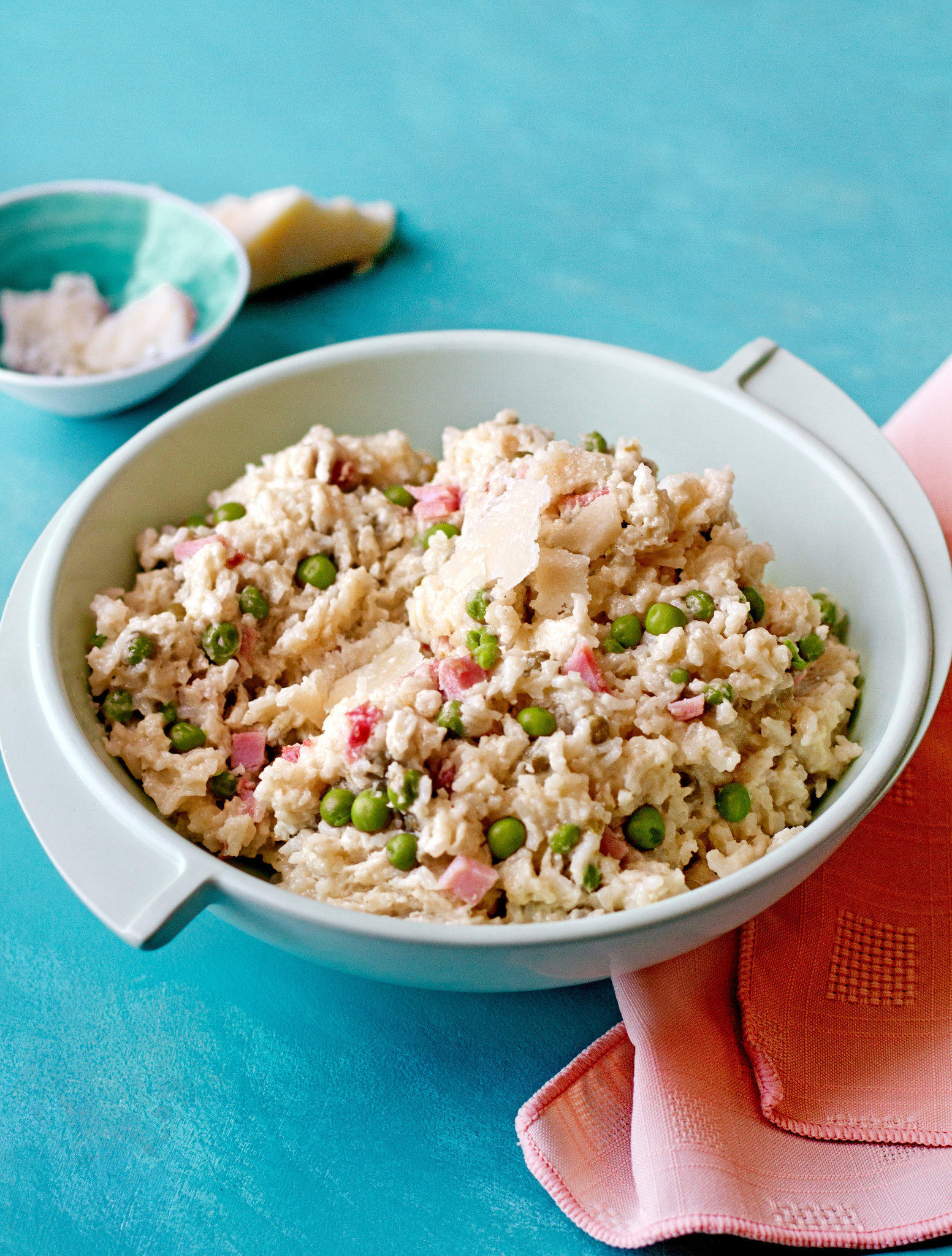 - Slowly add 1/2 cup of hot stock, stirring until the rice absorbs it. Then add 1/2 cup of cream, again stirring until the rice absorbs it. Repeat until all the stock and cream is absorbed and the rice is tender and creamy, about 40 minutes. Stir in the ham and peas. Taste and salt if needed. Shower with grated Parmesan and serve hot.