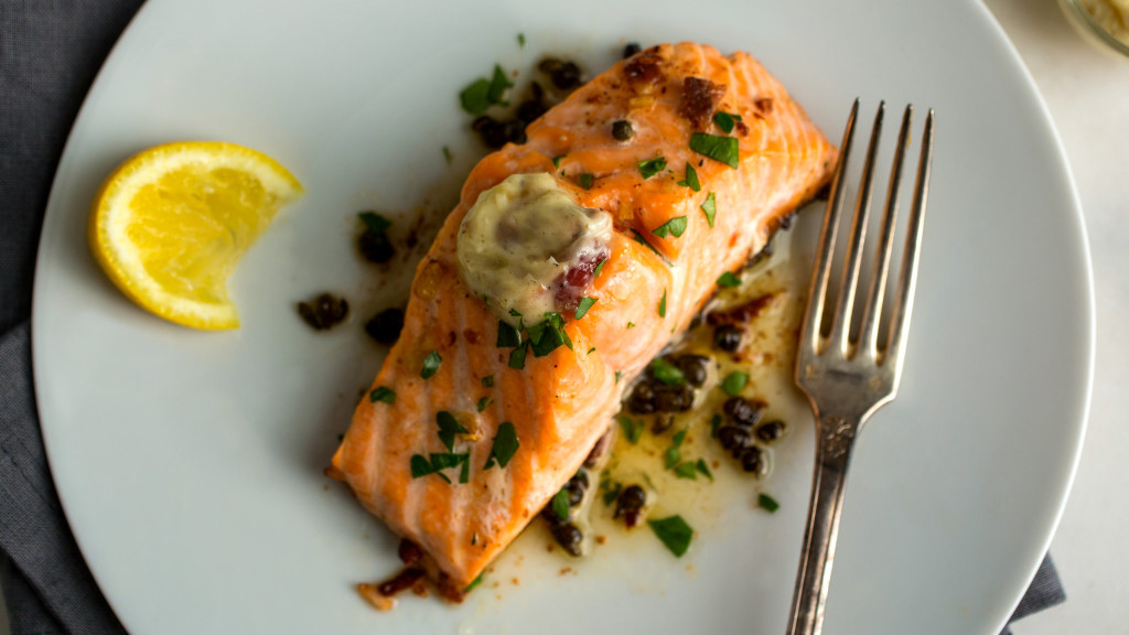 - Remove pan from oven and add remaining anchovy butter to pan to melt. Place salmon on plates and spoon buttery pan sauce over the top. Squeeze the lemon half over the salmon and garnish with chopped parsley. Serve.