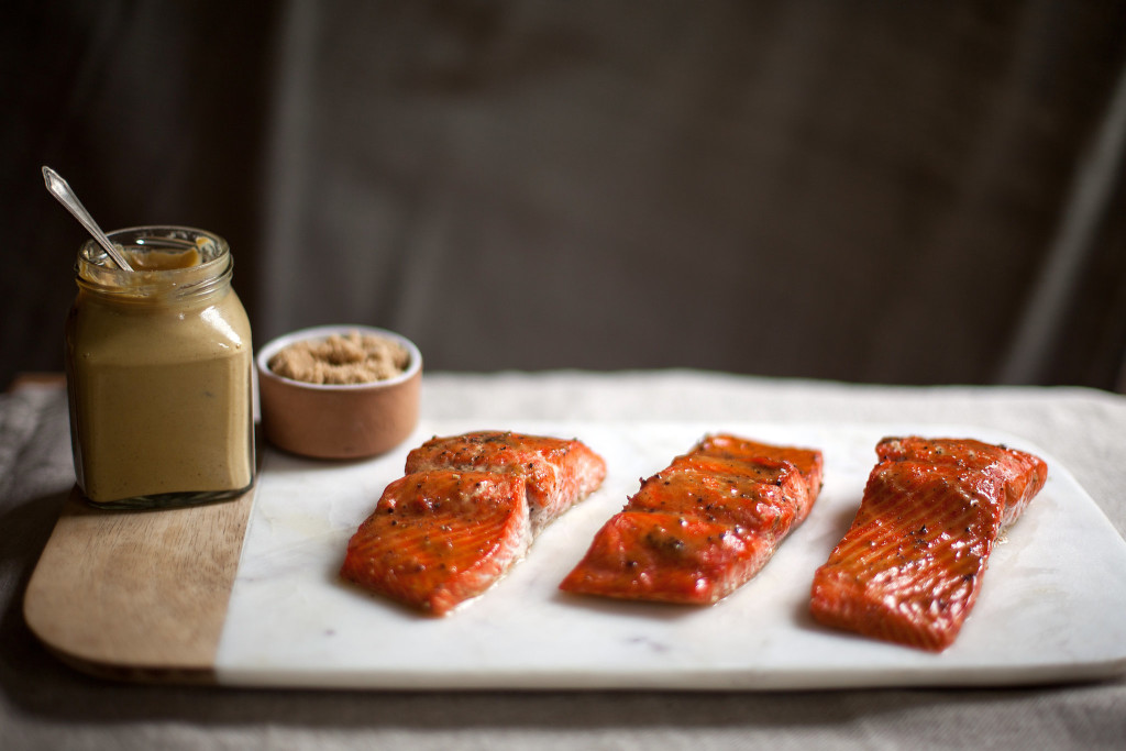 2. Make a mixture of Dijon mustard and brown sugar to the degree of spicy-sweetness that pleases you. Salt and pepper the salmon fillets.