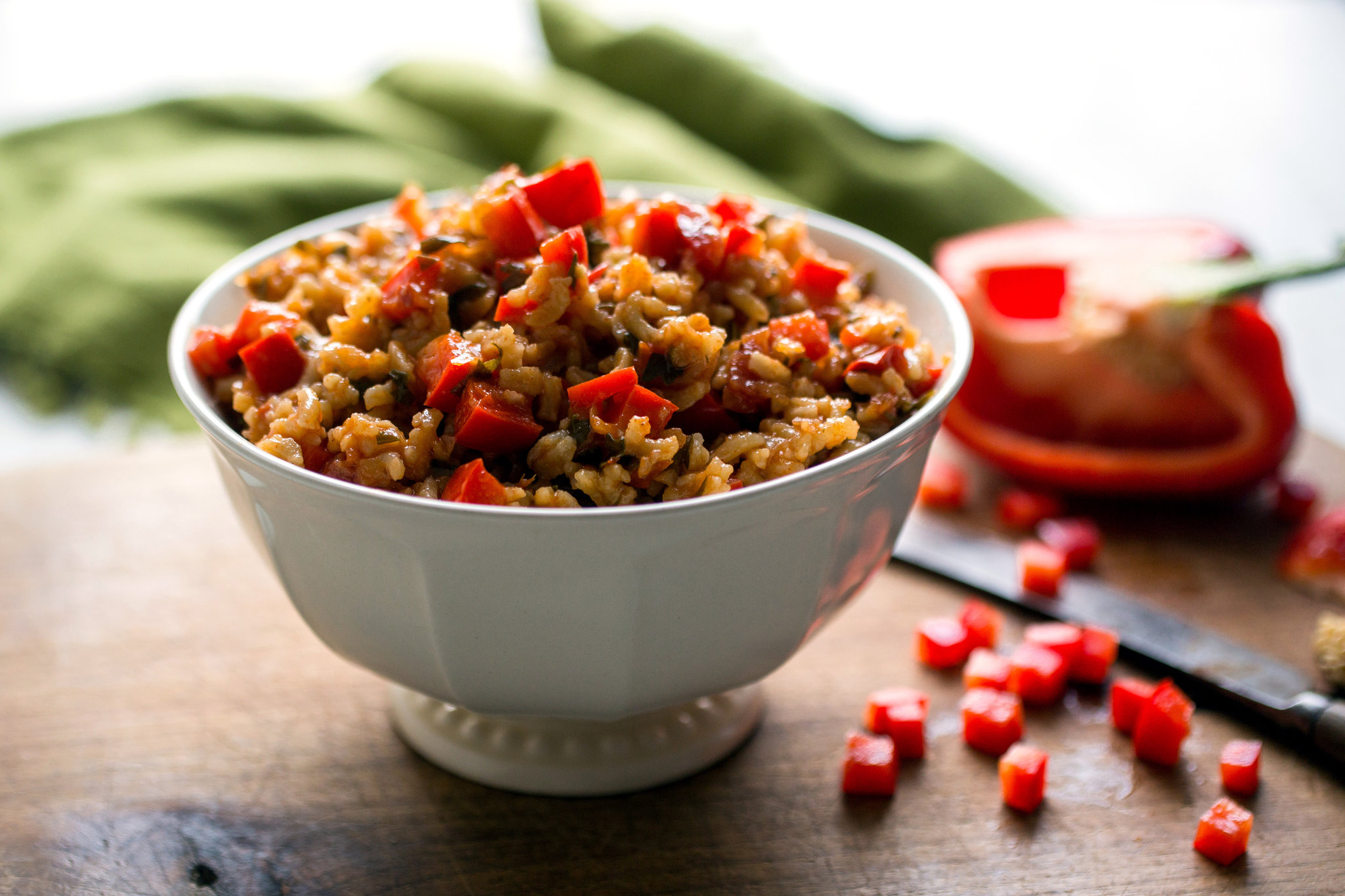This mildly spicy Lenten vegetable rice is prettiest when made with rice, because the saffron will have more of an impact on the color. But I also love it with bulgur, and especially with freekeh, which is very compatible with the peppers, chile and paprika. If you make it with rice, remember that in the traditional Greek dish the rice is very soft, as it is here. If you don’t want the dish to be spicy leave out the chile pepper.