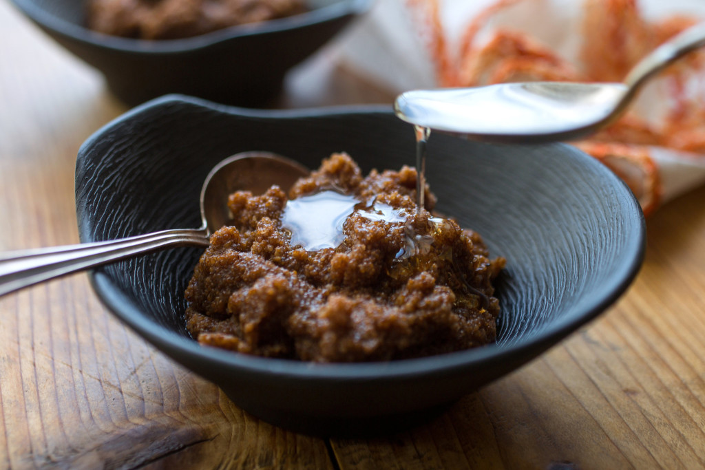 Teff is a challenging grain to work with. The flavor is strong, the grains tiny, and the mixture stiffens up very quickly once the grains are cooked. The chef Jason Bond makes a comforting teff polenta at his Bondir restaurants in Cambridge and Concord, Mass. He cooks the teff on top of the stove, in milk, and adds a finely chopped chipotle chile to the mix, which contributes a nice smoky/hot flavor. I liked the idea of teff polenta, and tried a few different methods for it. Teff will cook up in about 20 minutes on top of the stove, but if you use the oven-baked method outlined here, modeled on the method I often use for cornmeal polenta, you will get a creamier result. The oven method takes much longer, but the time is unsupervised – no frequent stirring as you must do on the top of the stove. This method doesn’t work so well if you use milk, however, because the milk forms too much skin in the oven, which forms curds when you stir the mixture (though I do like the flavor of the teff cooked in milk a lot). I tested the recipe using both stock and water, and liked both results equally. The chipotle adds a nice smoky/spicy flavor to the teff, but you can leave it out and just focus on the nutty flavor of the teff alone, with the hazelnut oil. I love the toasted hazelnut oil finish; it harmonizes with the nutty/earthy flavor of this grain. Serve the teff as a side dish or top with roasted vegetables or a vegetable or bean stew. You can also allow the teff to stiffen, then cut into squares and fry in the squares oil or grill them. You will get best results if you soak the teff for a few hours or overnight.