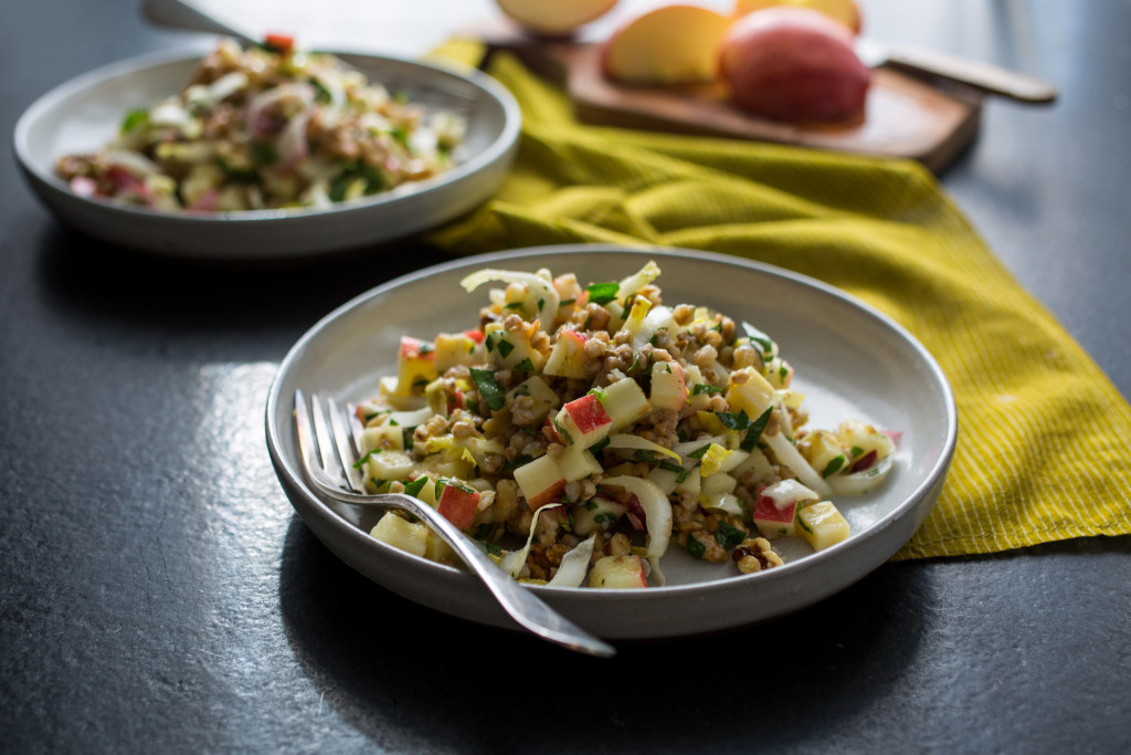 Nutty, earthy grains of kasha go beautifully with crunchy, juicy apples and bitter endive, long a favorite salad combo. Cut the apple into small dice – 1/4 to 1/2 inch – to maximize this marriage of grain, fruit, nut and bitter salad green. The acid to oil quotient in the dressing is on the low side; I use lemon juice only and sweeten the mix with a little honey. You could also use agave nectar, and leave out the Gruyère in the salad for a vegan version; though I love the Gruyère here because it, too, has a nutty flavor. This salad holds up well on a buffet.