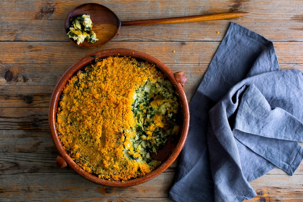 • Advance preparation: The blanched greens will keep for 3 or 4 days in the refrigerator. The filling can be made through Step 4 a day or 2 ahead. The gratin will keep in the refrigerator for 3 or 4 days and can be frozen.