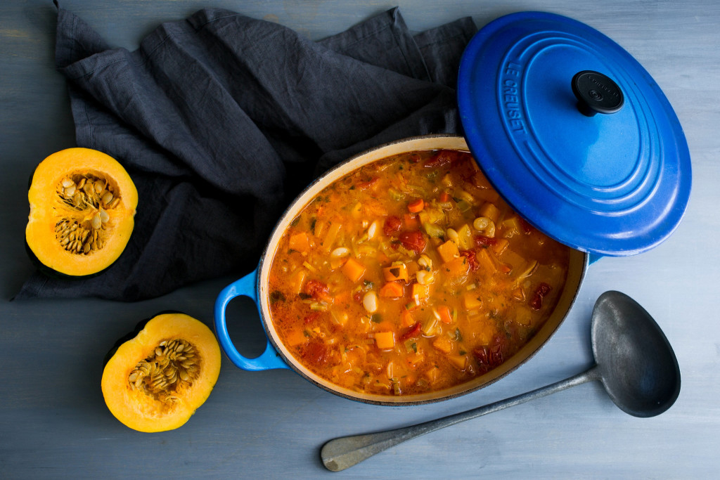 - Add beans and their broth to tomato base, stir together, add bouquet garni and bring to a simmer. Cover and simmer over low heat for 30 minutes. Add winter squash and continue to simmer for another 30 to 45 minutes, until squash and beans are very tender. Taste, adjust salt, and add freshly ground pepper to taste.