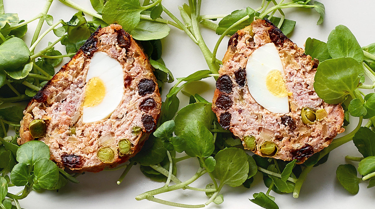 - In a large mixing bowl, beat the remaining 2 eggs, and combine with the cheese, ham, peas, raisins, onion, sausages, relish, ketchup, salt and a few cracks of black pepper. Fold in the ground pork, then mix it with your hands until thoroughly combined and the mixture starts to stick together. Heat a dry frying pan over medium heat, and cook a spoonful of the mixture. Taste the mixture, and add more salt or pepper if needed.