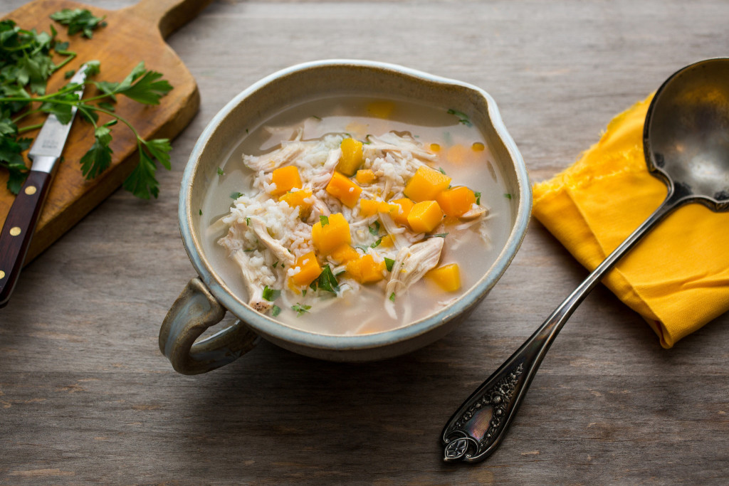 This is the kind of soup you can whip up on a whim if you have garlic on hand and either summer or winter squash. You can make a vegetarian version of the soup just by eliminating the turkey. Otherwise it is one more healthy option for your Thanksgiving leftovers. When I made the soup the first time I used a lingering half-zucchini that I found in my sister’s refrigerator. At this time of year you might be more likely to have winter squash on hand. Either will work. Winter squash will take 10 to 15 minutes longer to cook.
