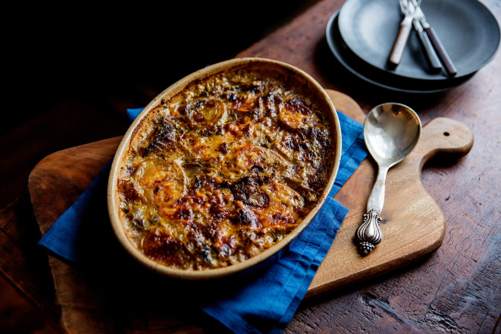 Wild mushrooms add a luxurious dimension to this comforting, almost classic potato gratin. There is no cream here, just milk mixed with porcini broth (the result of soaking dried porcinis for 30 minutes in boiling water). You can use a mix of wild mushrooms, or just one type. Sauté them with onion or shallots, garlic and savory herbs (thyme and rosemary or sage), season them well and toss with the potatoes. The gratin requires 1 1/2 hours in the oven; first you will doubt that all of the liquid will be absorbed by the potatoes, and about halfway through you will be convinced that the finished dish will be watery and the potatoes hard. But by the end, once all the bubbling has subsided, the soft potatoes will have imbibed all of the flavorful liquid in the dish, and the top and edges of the gratin will be crusty, the way a gratin should be.
