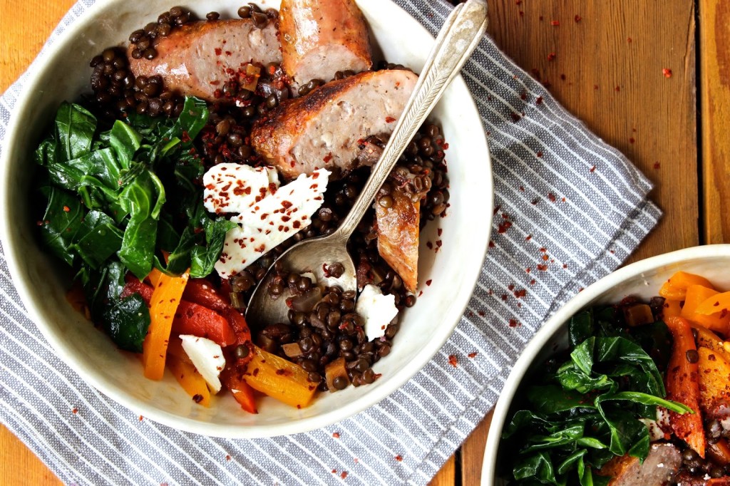 Slice sausages into bite sized pieces. Add sausages, collard greens and roasted bell peppers to the lentils and stir to combine.  Add more salt & pepper if necessary.  Serve in bowls topped with crumbled Feta and finish with a sprinkle with Aleppo pepper.