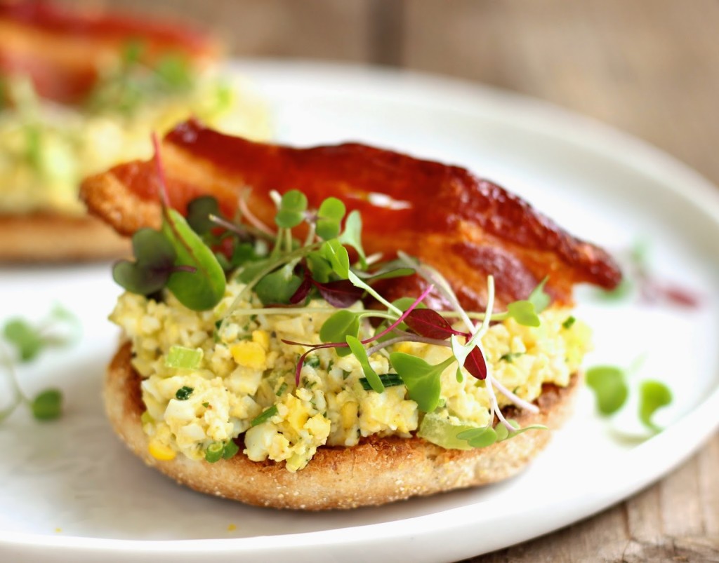 Toast English muffins.  Top each half with a generous amount of egg salad.  Break bacon slices in half and place on top of each open face English muffin/egg salad combo.  Top with a garnish of micro greens or arugula.