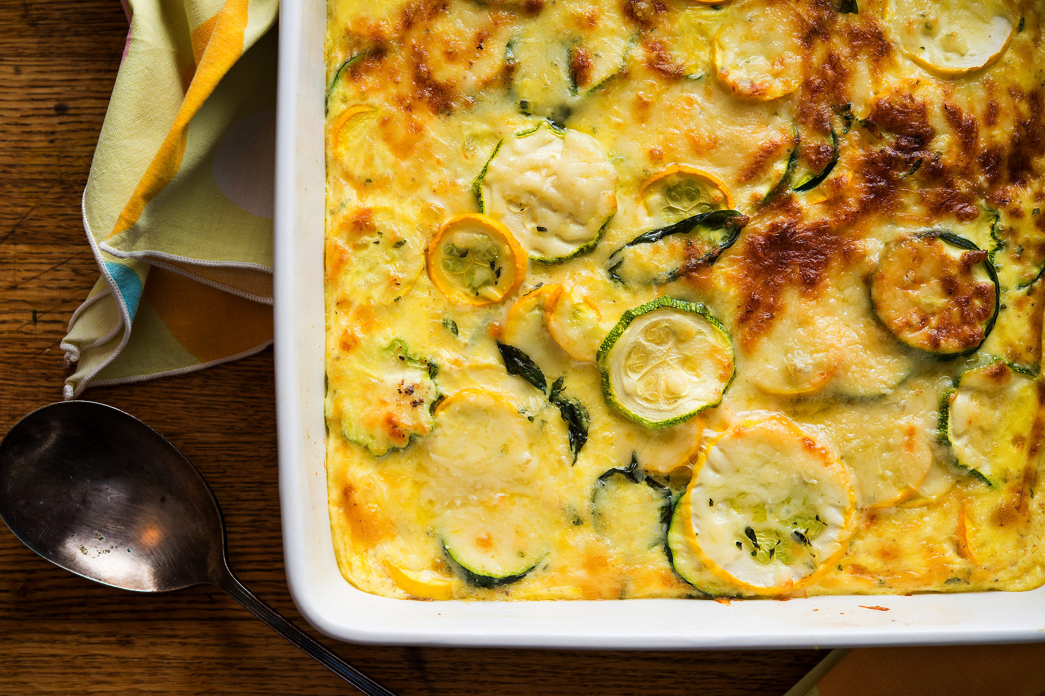 - Butter a 2-quart low-sided baking dish, and arrange blanched zucchini over bottom. Scatter cheese over zucchini, then pour in custard.