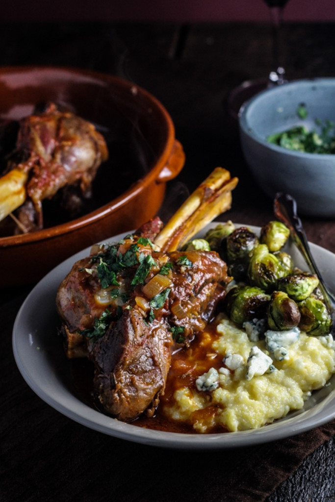 Since we had two lamb shanks in the freezer that needed to be put to good use, we decided to make a slow-braised lamb in a rich tomato sauce, served over polenta jazzed up with fresh corn and blue cheese, and a side of roasted brussels sprouts. With a few glasses of a nice red wine and a classic apple pie for dessert, it was a delicious summer-meets-fall dinner . In all honesty, this is one of the best meals I’ve had in recent memory – fall-off-the-bone tender lamb in a tangy sauce and rich and cheesy polenta with bursts of sweet fresh corn make a really excellent pairing, perfect for a lazy, chilly, Sunday afternoon.