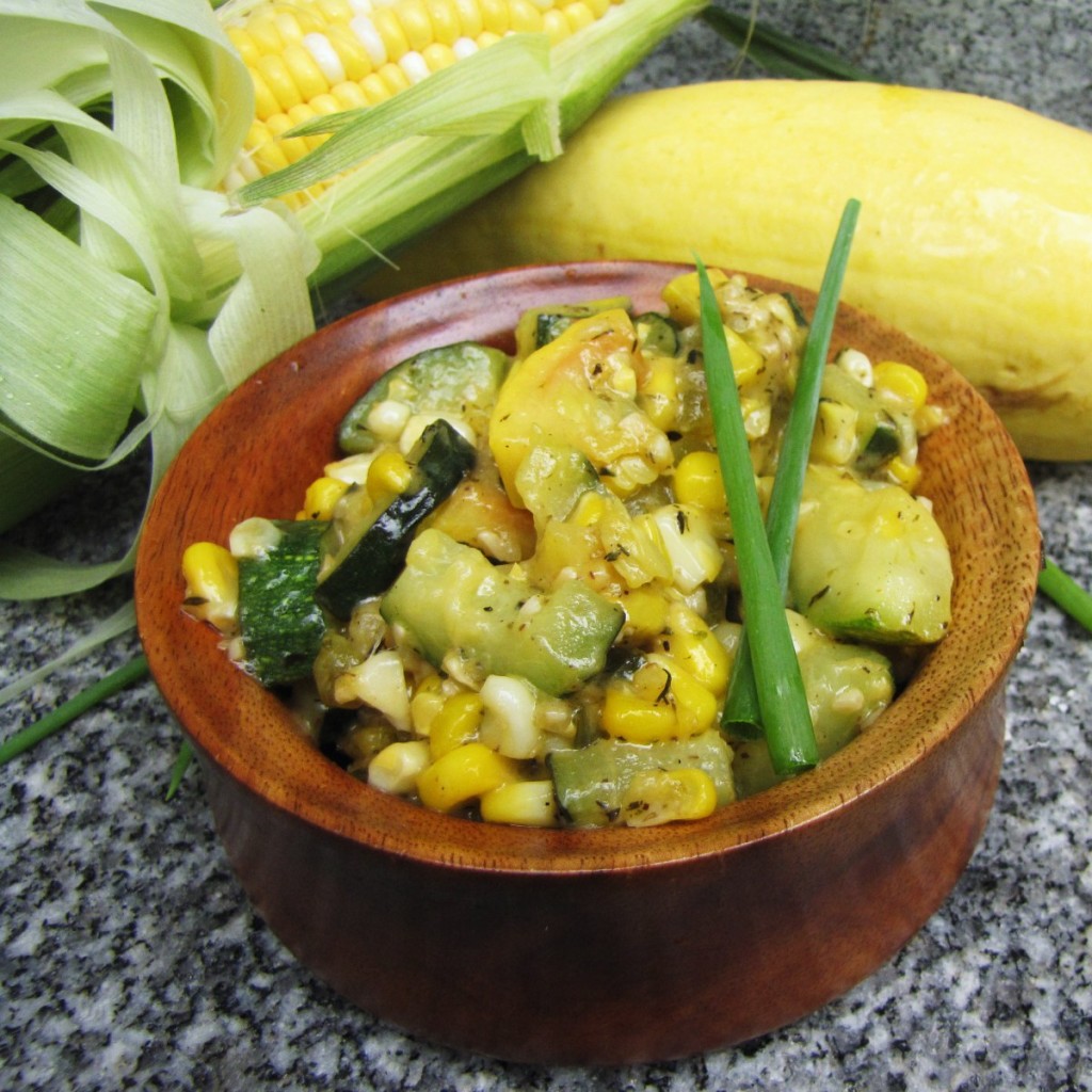 - Heat olive oil and water over medium-high heat. Add washed, diced zucchini and squash, and sautee for 7 minutes, stirring occasionally. Add garlic, green chile, scallion, dried thyme, onion powder, salt, and pepper, and cook for another 2 minutes. Add kernels from corn cob. Lower heat, and cook until everything is soft, about 5 minutes more. Remove from heat and stir in cheese, allowing to melt completely and spread evenly throughout dish. Serve warm.