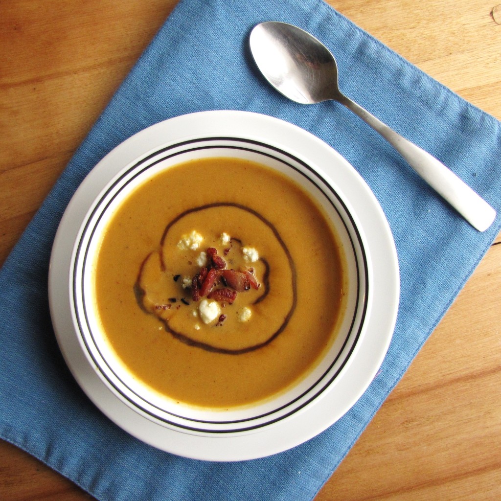 Anyway, this soup uses molasses, the safer, liquid alternative to brown sugar. So I feel comfortable making it. You probably will too, unless you were in Boston for the Great Molasses Flood of 1919, in which case you might want to avoid all sugar products. But I hope you weren’t, because this soup is delicious. Although, I might only feel like that because it is a vehicle for blue cheese and bacon. I’m not sure how I would feel about it if it didn’t have those two components. So let me rephrase that: this soup is a delicious vehicle for blue cheese and bacon. And if you’ve had a leftover can of pumpkin in your cupboard since the great iron chef duke pumpkin challenge, and you also have 15 minutes to spare, why not make it?
