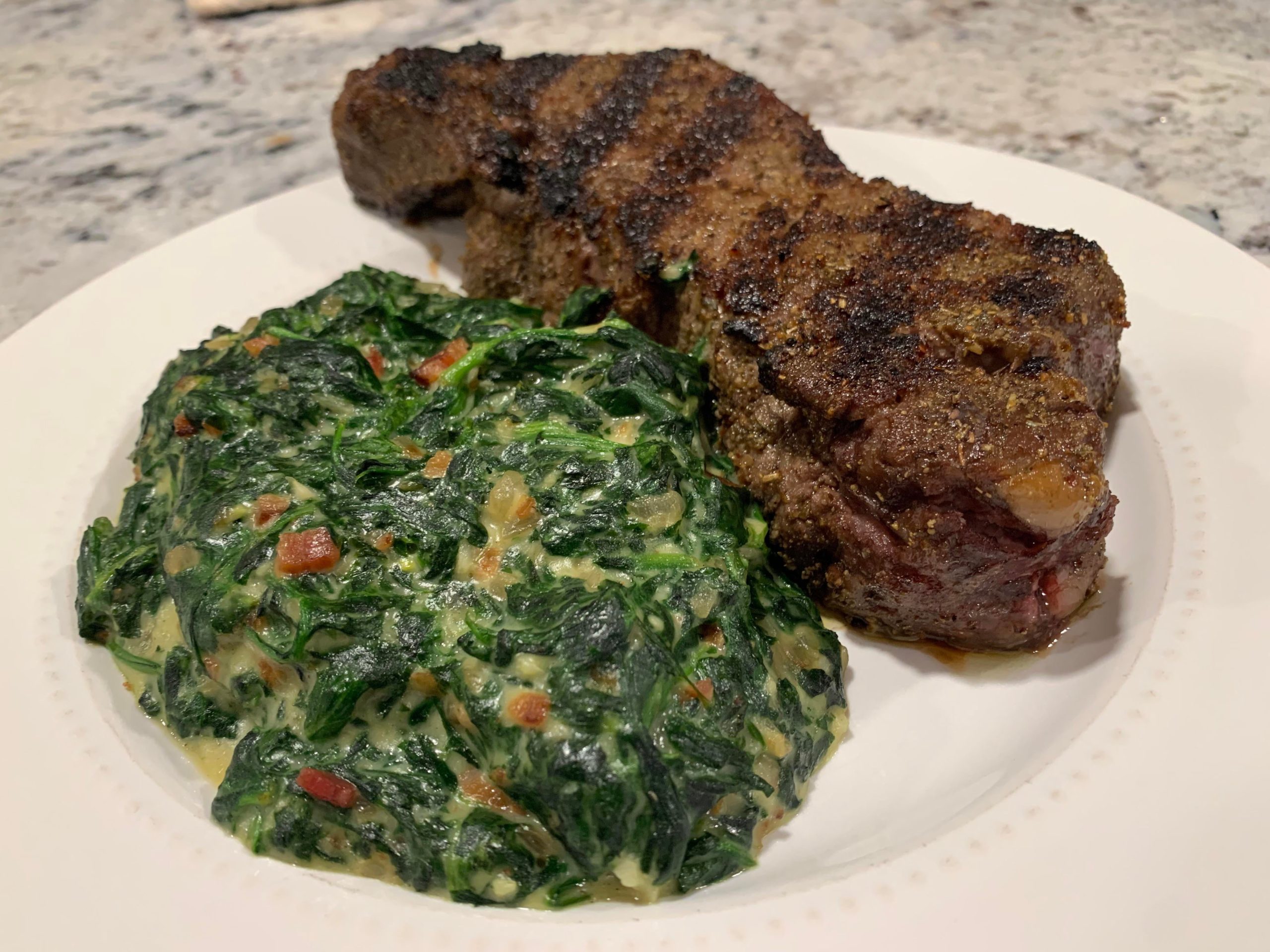 Rare New York Steak with Creamed Spinach.