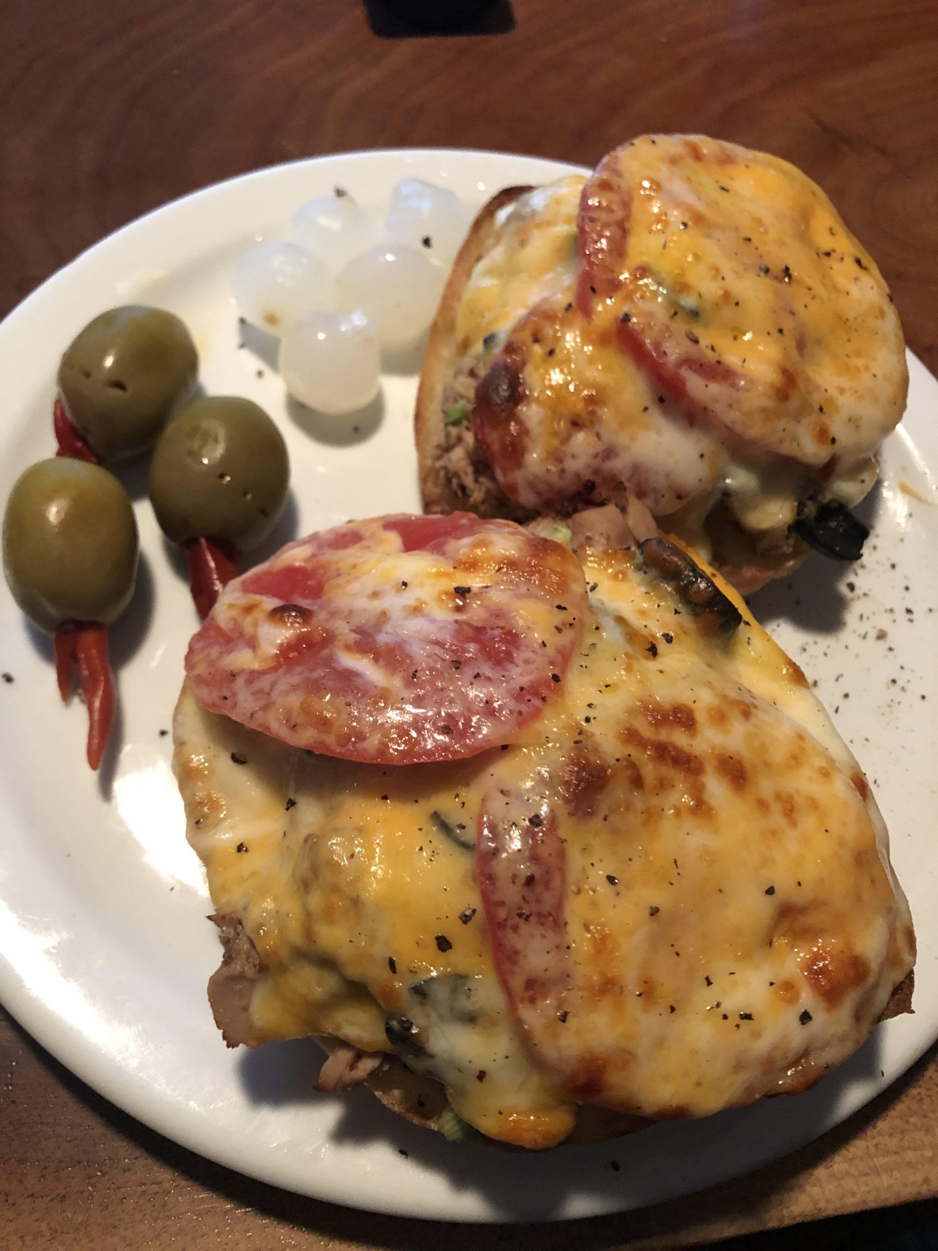 Tuna melt on ciabatta with pimento stuffed olives and pearl onions