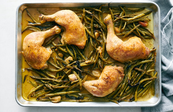 - Heat the oven to 325 degrees. Toss the green beans, garlic cloves and sage leaves with ¼ cup of the olive oil. Season with salt and pepper, and arrange in an even layer on a sheet pan. Rub the chicken with the remaining 2 tablespoons oil and 1 tablespoon salt. Arrange among the green beans and season with black pepper; scoot any green beans out from under the chicken. (It’s okay if the green beans are clumped together.) Roast, tossing the green beans occasionally, until the chicken is cooked through, and the green beans are dark green and wrinkled, about 1 hour 30 minutes.