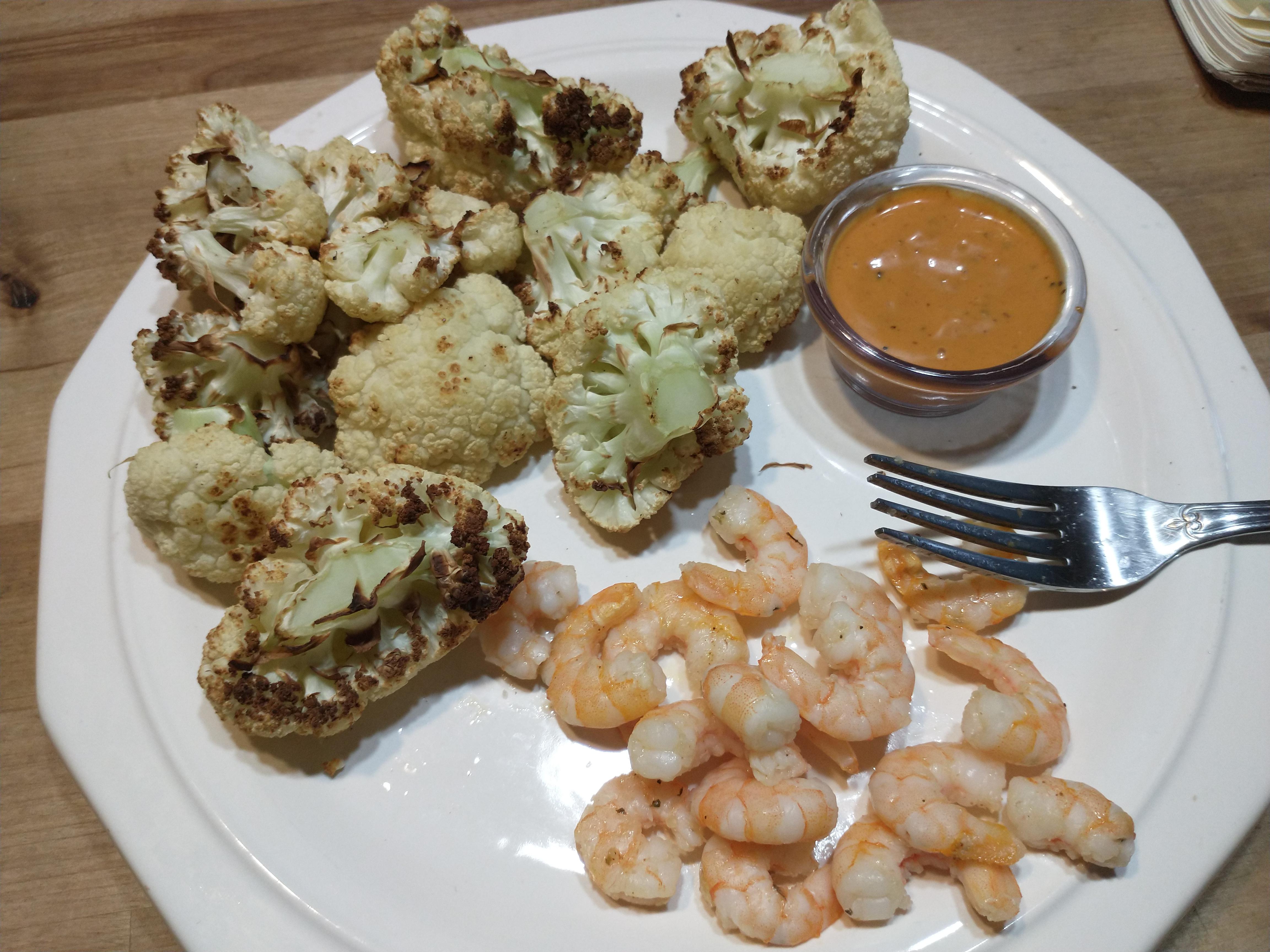 Air fried cauliflower, fry sauce, and shrimp. Roughly ~275 cals and quite filling