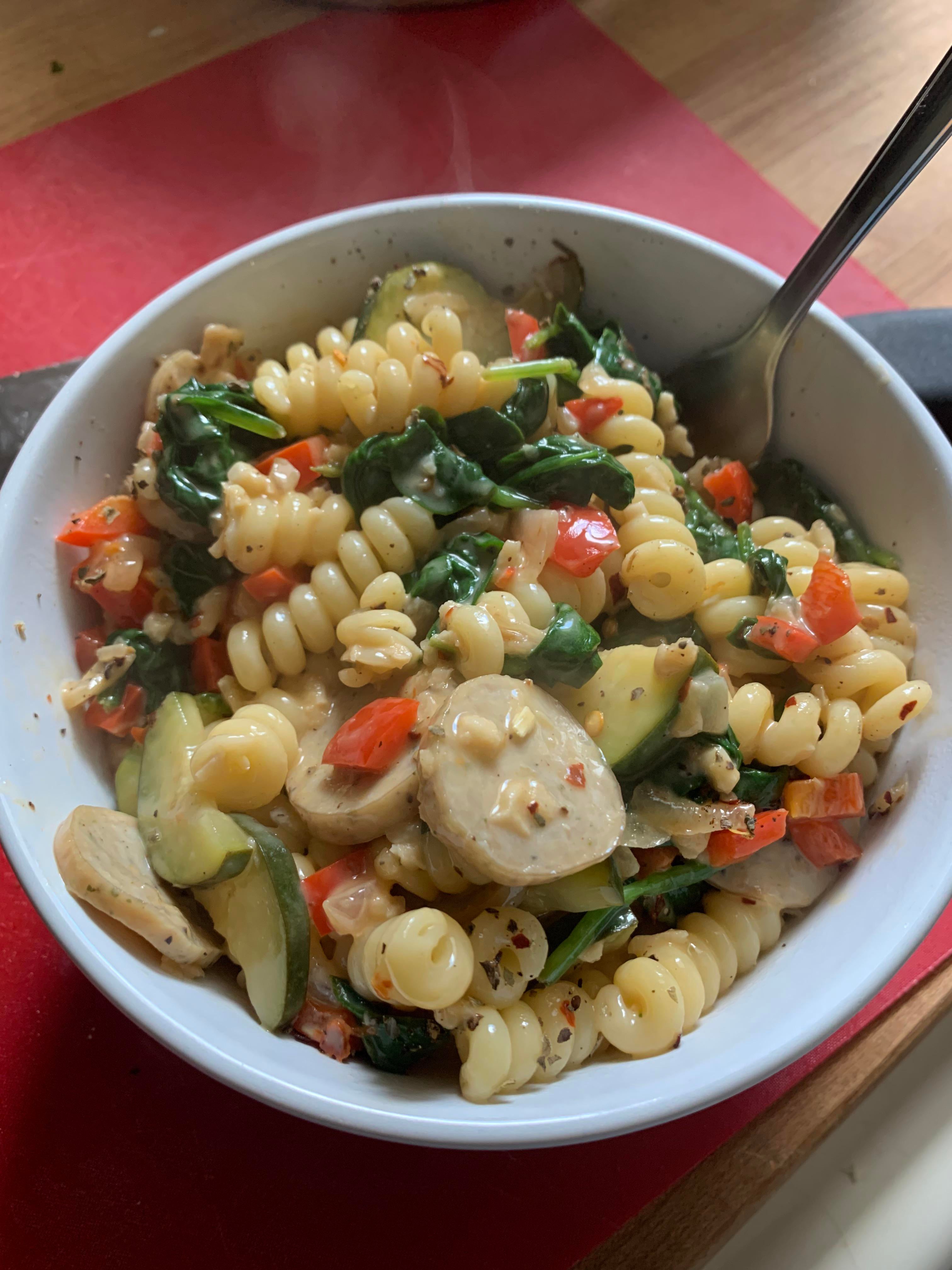 Pasta primavera for lunch today! Back on the mindful eating bandwagon after a scale shock 🥶 Dining and Cooking