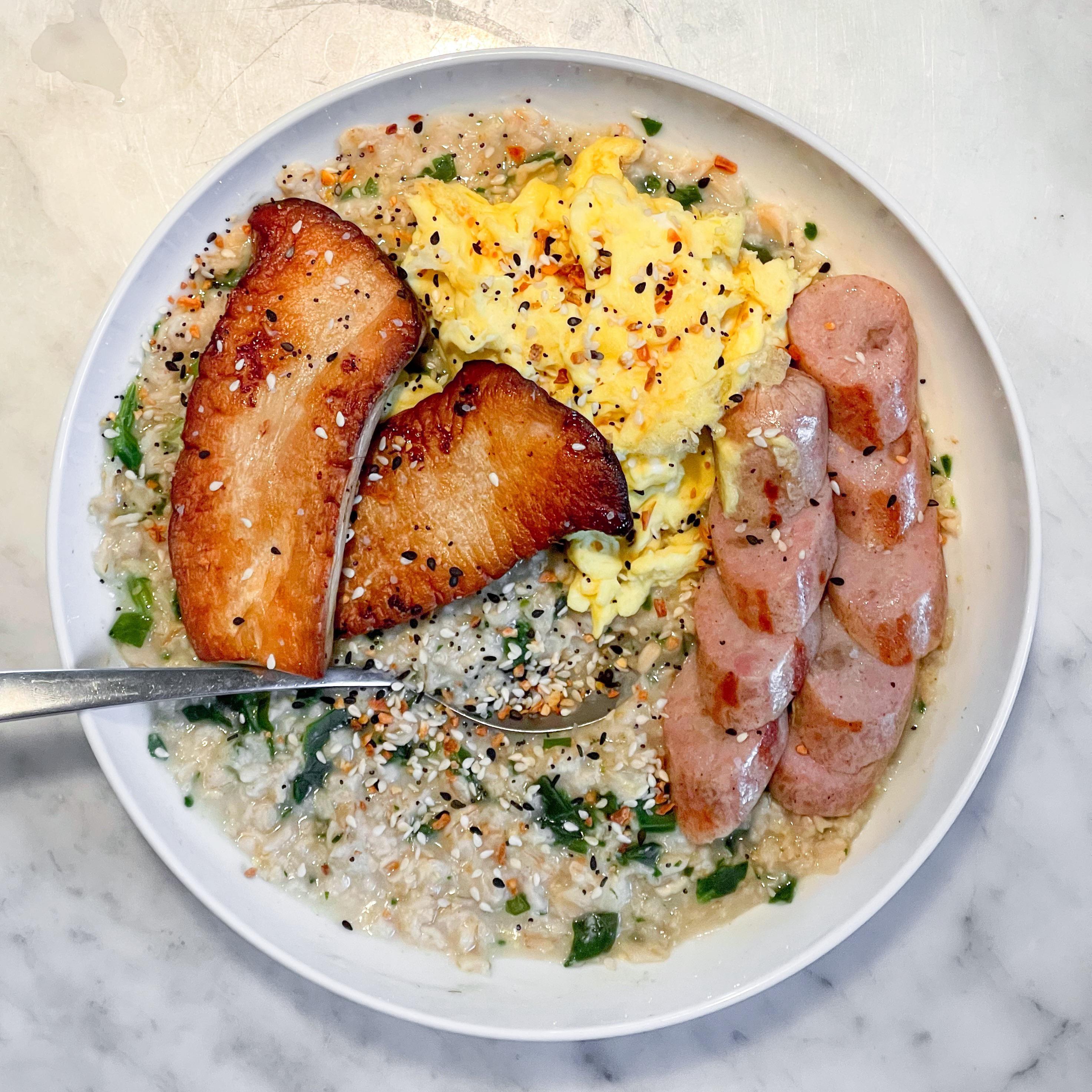 First time making savory oats and I’m never looking back! About 500 calories for oats with chicken stock and spinach, topped with seared king oyster mushroom, eggs, and chicken sausage
