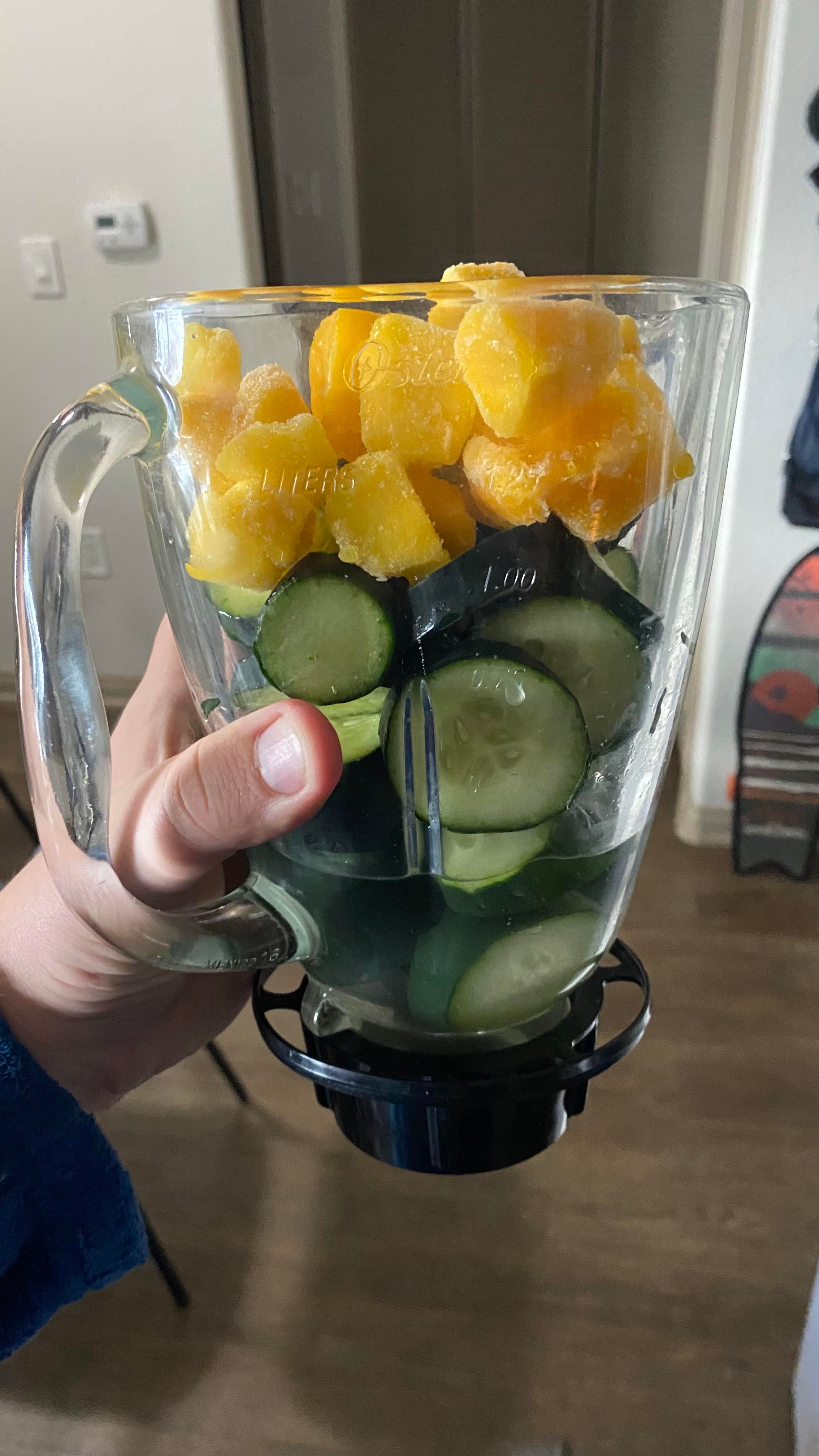For me, an important component of successful caloric restriction is forcing myself to have a giant smoothie first thing in the morning. It’s hydrating and extremely filling. Two refrigerated garden cucumbers, ~150 grams frozen fruit, refrigerated water. Under 200 calories
