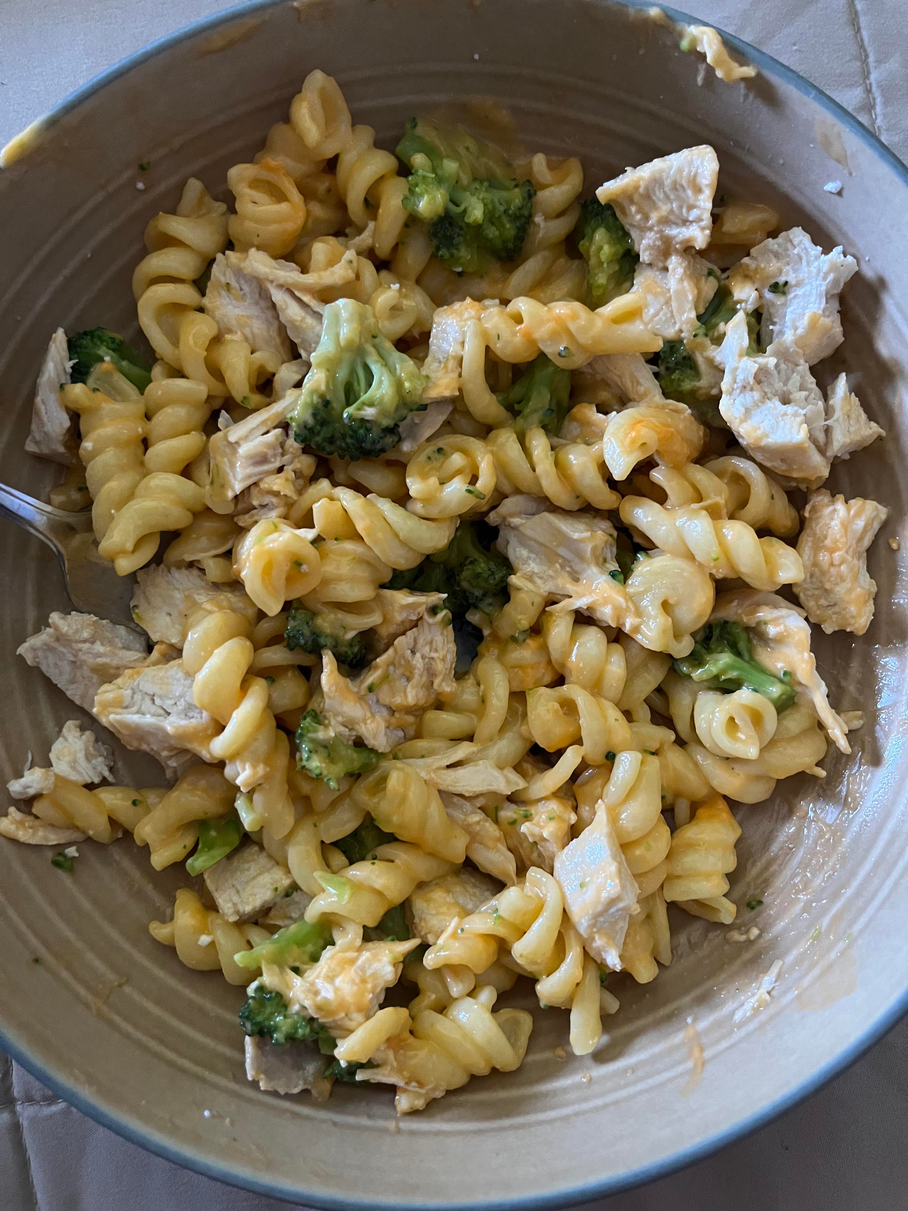 Lunch: birds eye cheesy broccoli pasta and leftover chicken! 464 calories, 41.5g protein, 50g carbs, 10.9g fat