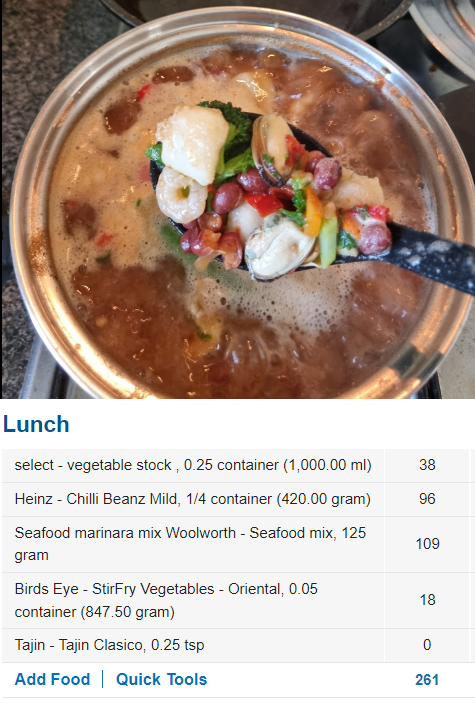 Today’s ‘Mexican marinara’ soup. Seafood marinara mix in vegetable stock with chilli beans, frozen veggies, and some Tajin seasoning. 1 litre stock, 500g marinara mix, 420g beans, 100g vegies. made 4 x 1-pint serves. Dining and Cooking