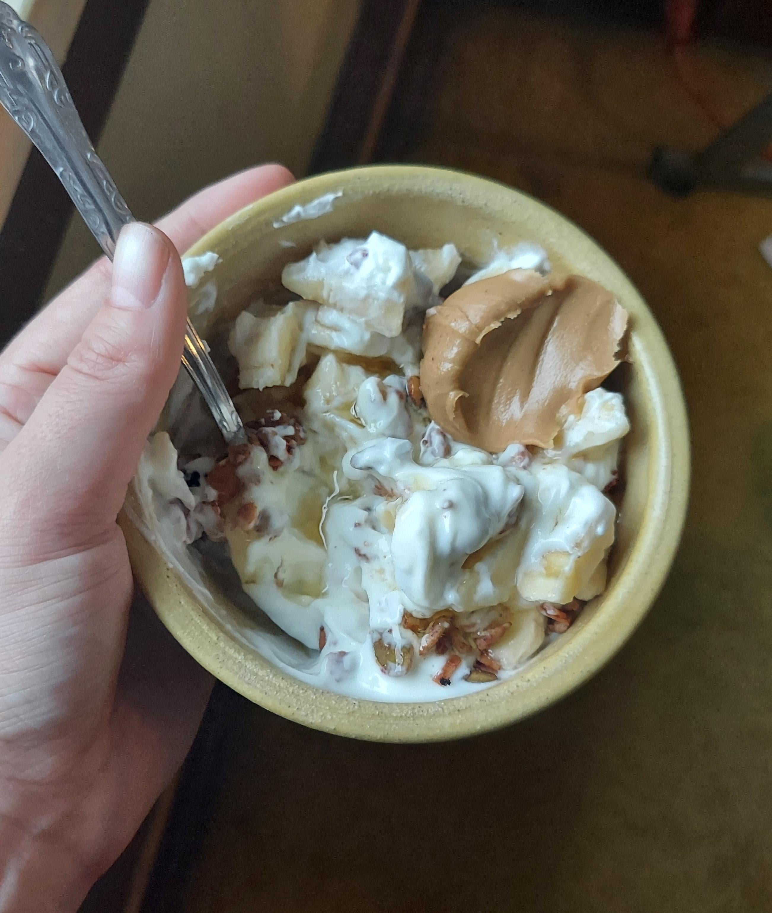 Greek yogurt bowl for breakfast, 390 calories, 17g protein