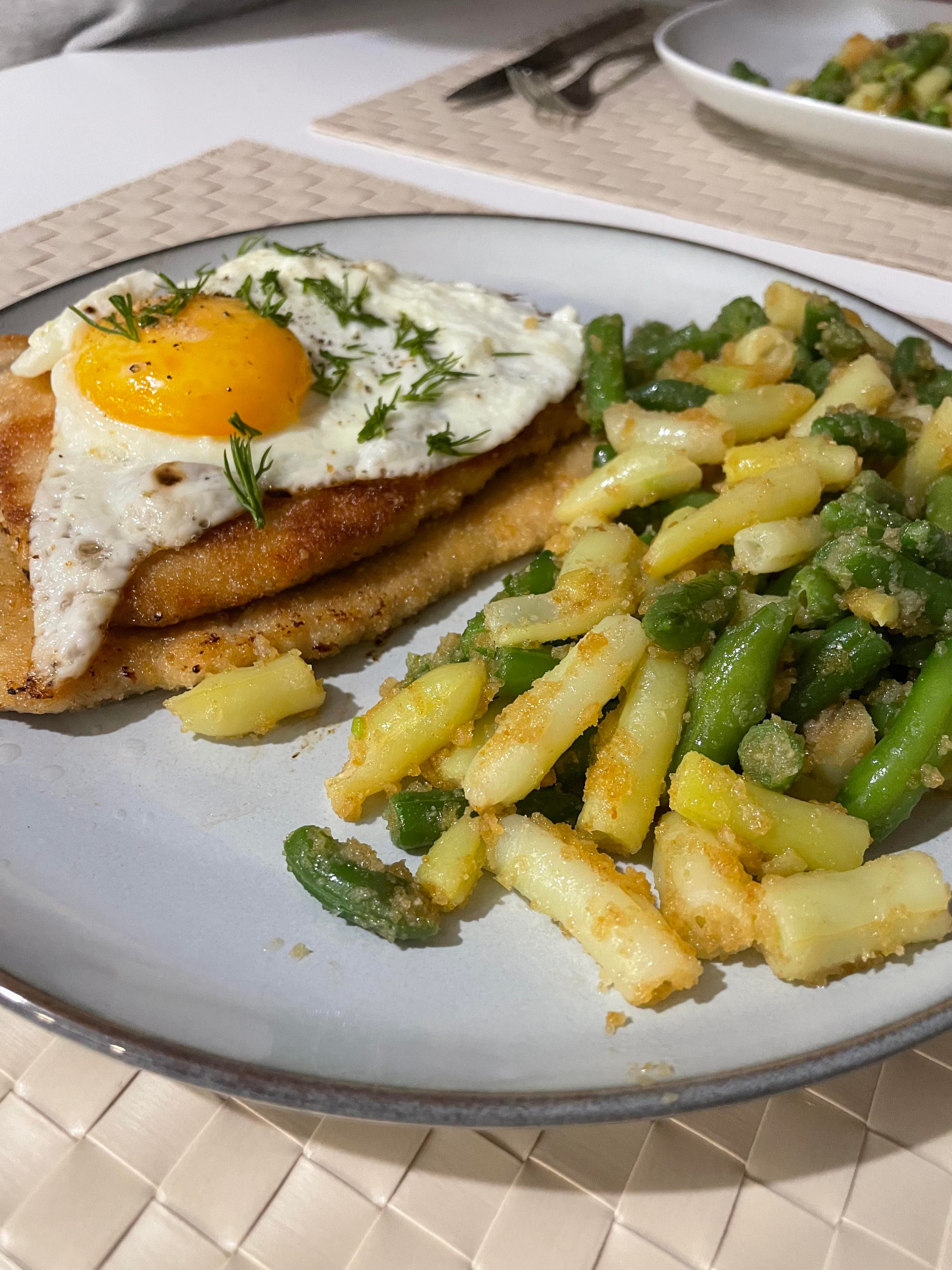 Pork chop with breadcrumbs, fried egg, yellow and green beans with butter and breadcrumbs. Around 800 kcal Dining and Cooking