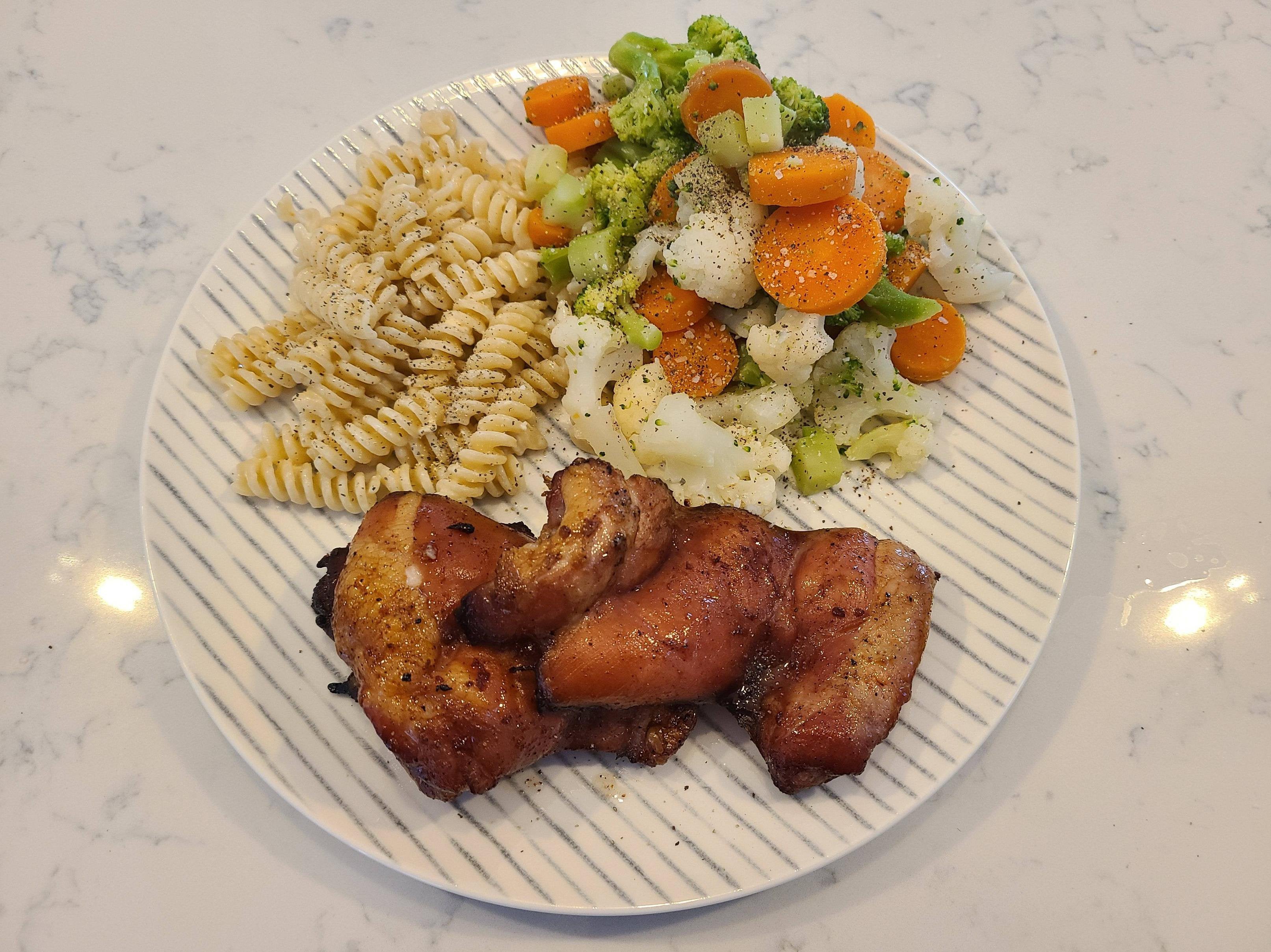543 calorie dinner – smoked chicken thighs, pepper jack laugh and cow mac and cheese, and a whole bag of frozen vegetables!
