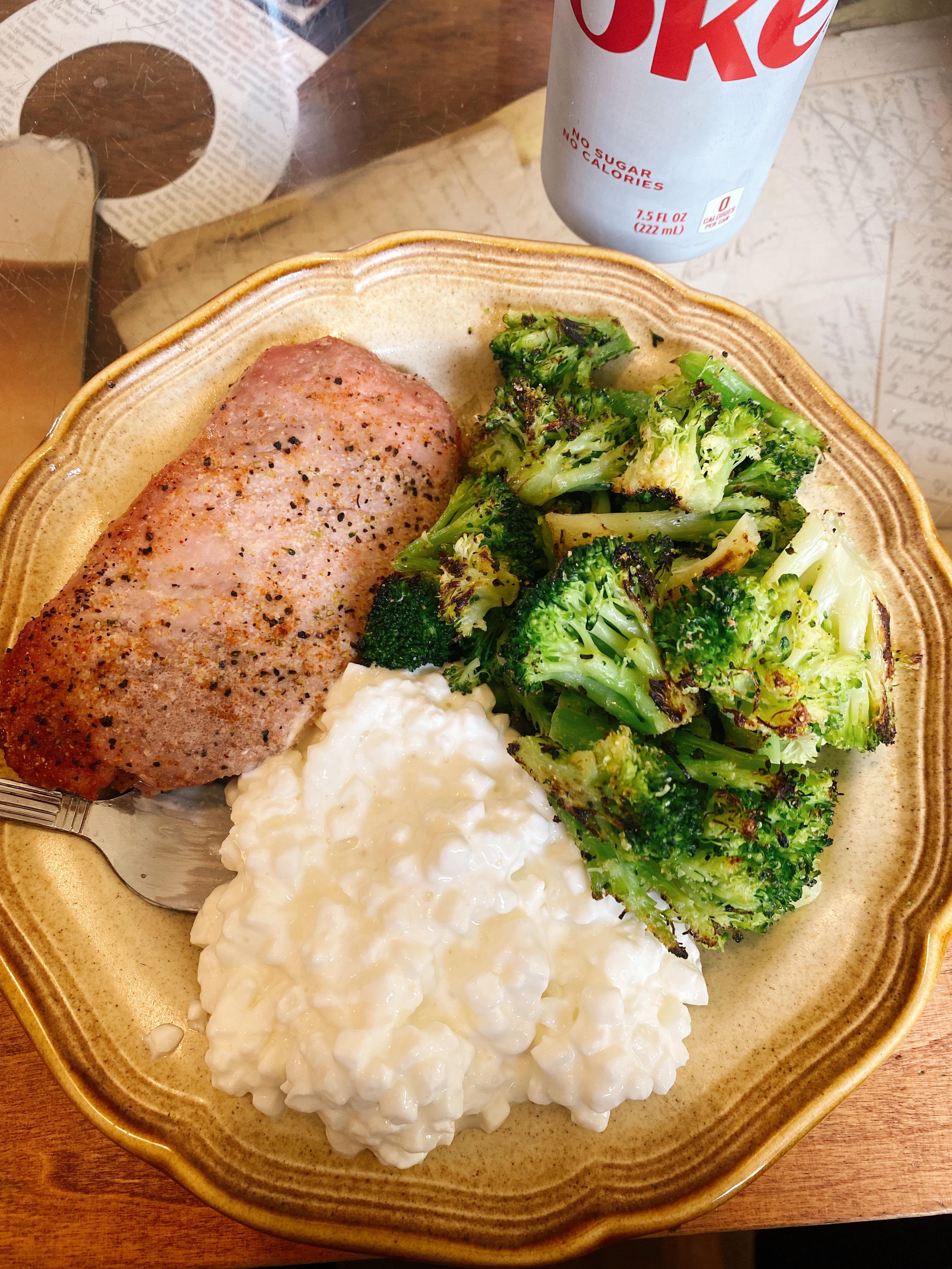 My current obsession meal. Lean pork chop with lemon pepper and spicy paprika, roasted broccoli, cottage cheese. 318 calories. Dining and Cooking
