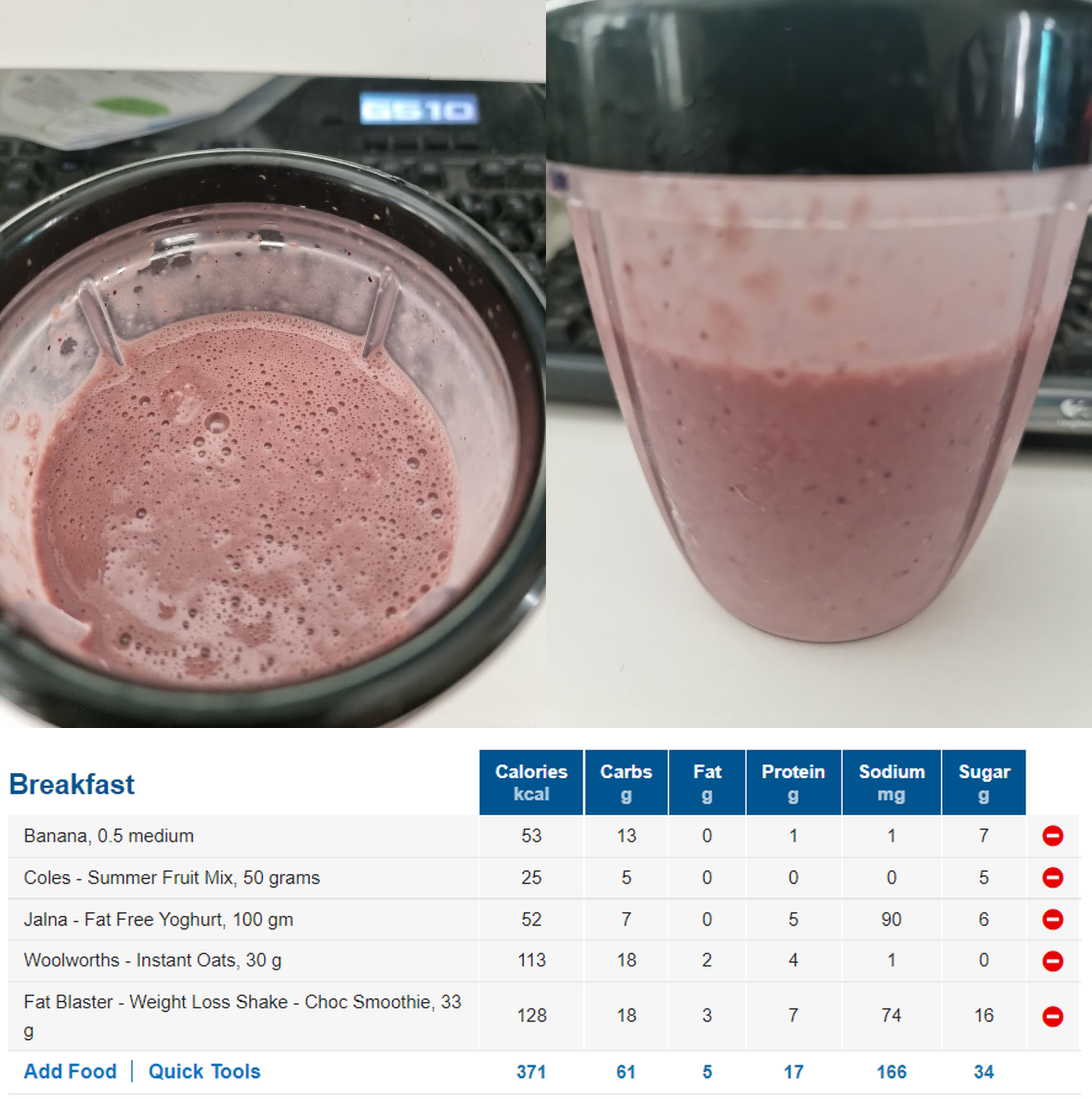 Not the most attractive smoothie (but then again, what smoothie is?) This is my post-run go-to “BoB” shake. Banana, Oats, Berries, protein shake and yoghurt, with water and ice. Shall try a higher-protein lower-carb powder when this can runs out.