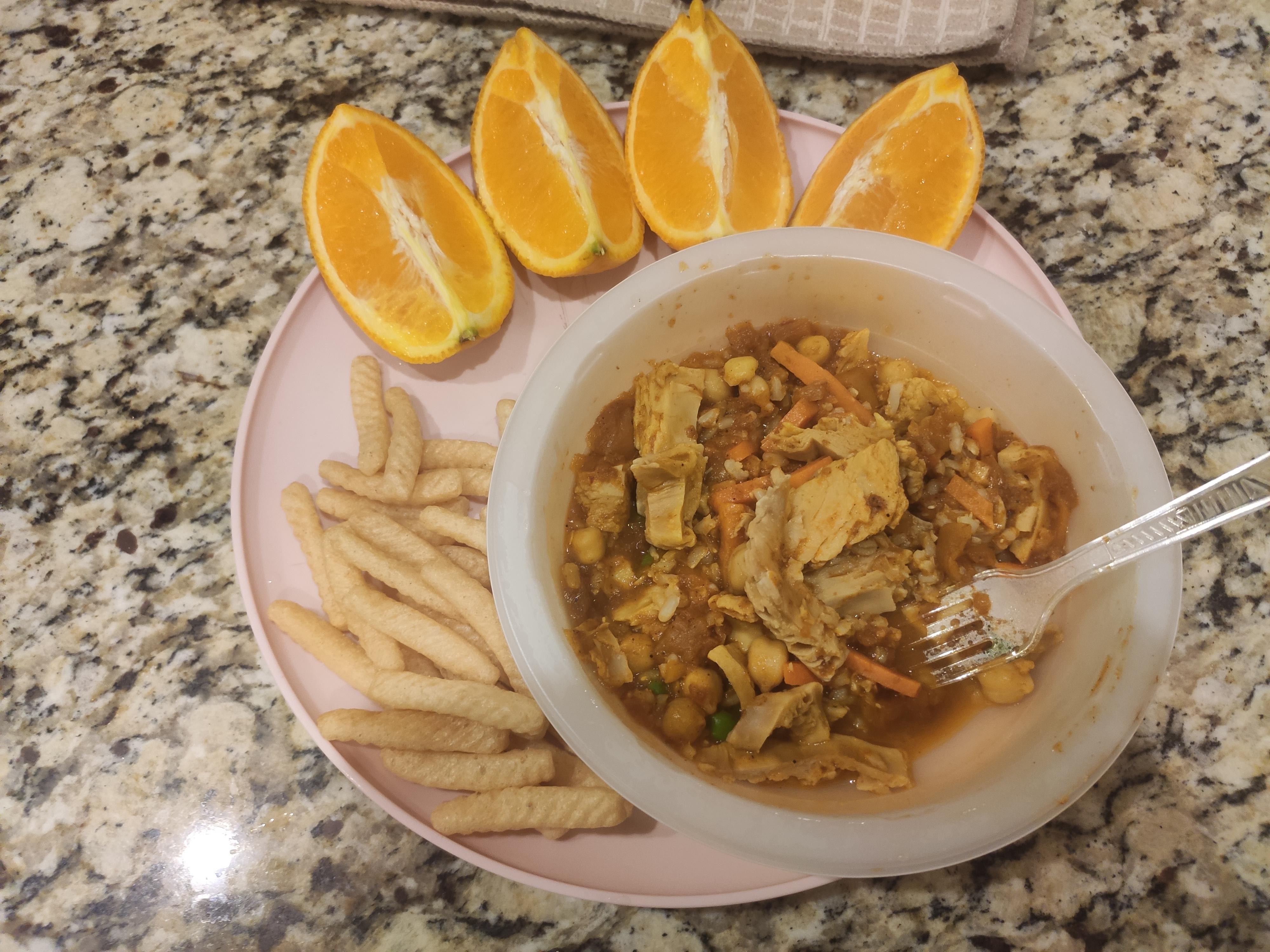 ~500 cals. butter chicken vegan frozen meal, prawn chips, oranges. lazy dinner 🙂 Dining and Cooking