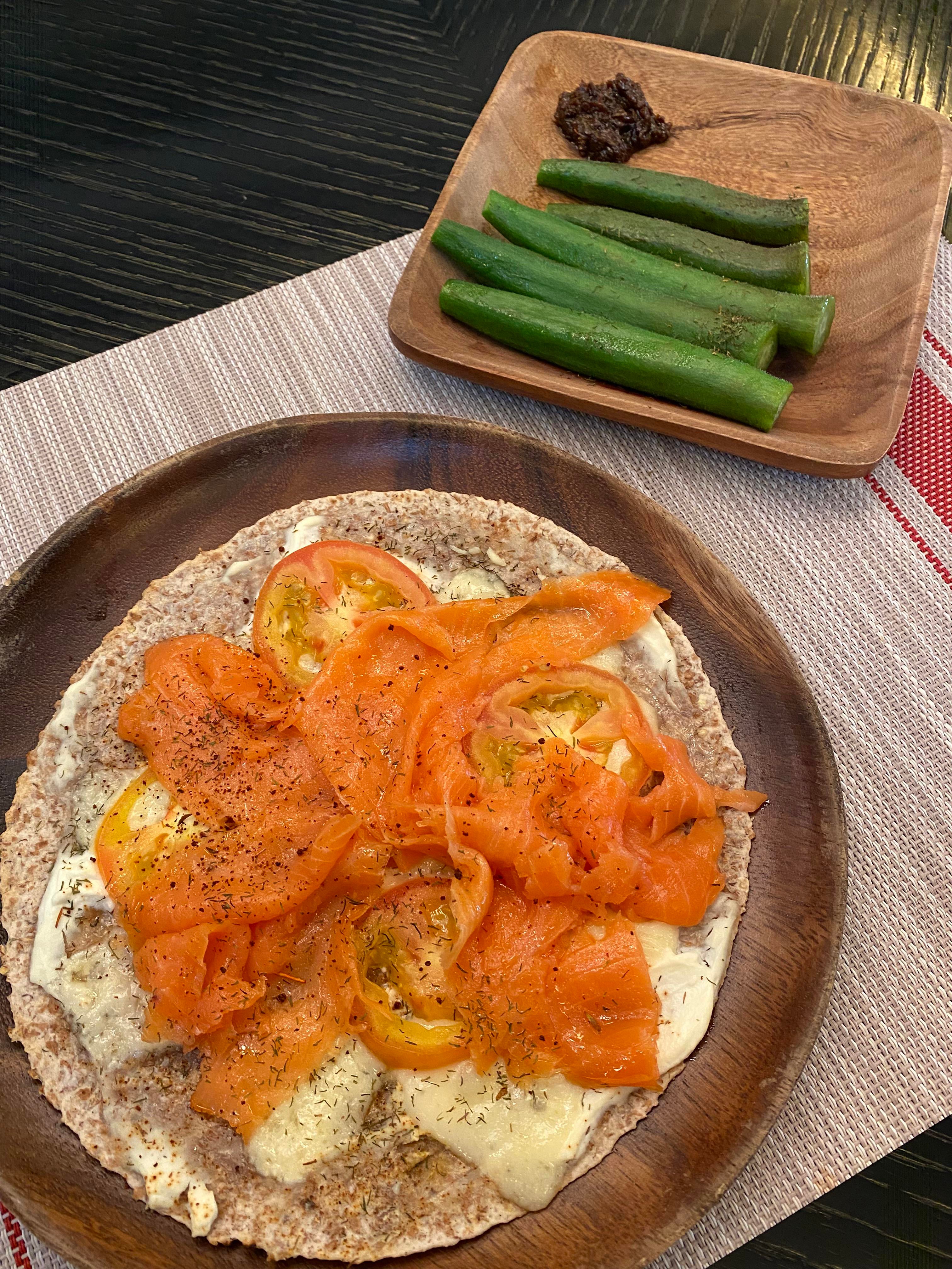 Joining the pizza tortilla onslaught: smoked salmon, mozzarella, cream cheese with side of okra and bagoong. 500cals approx.