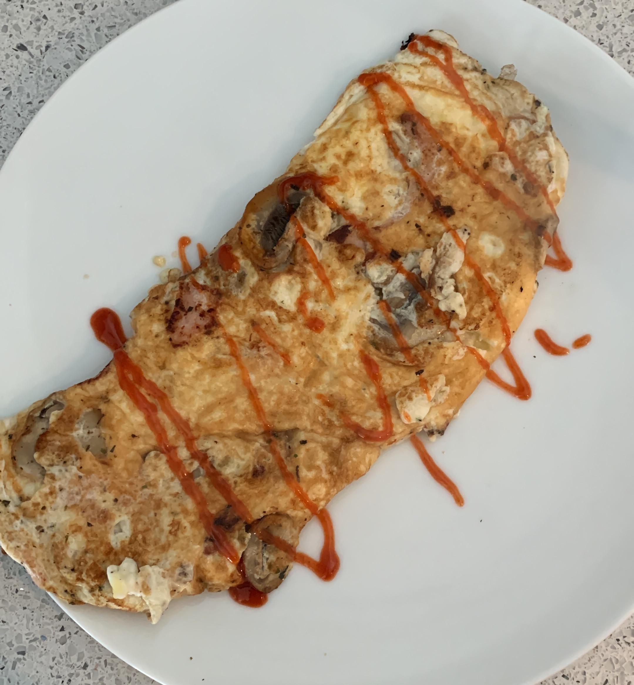 217 cals and 33g of protein. Egg white, mushroom, turkey bacon and herb omelette with siracha. Dining and Cooking