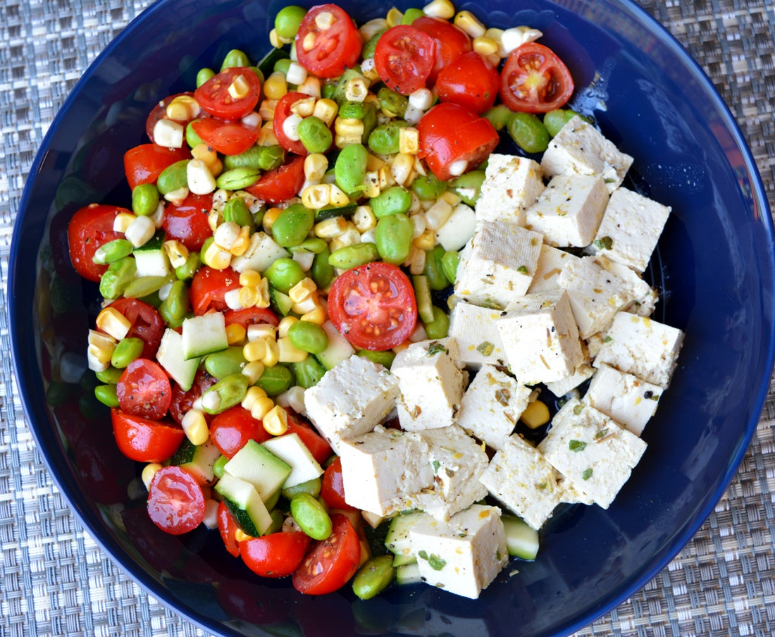 367 calories & 26 g protein. Marinated “feta” style tofu with corn, tomatoes, edamame, and zucchini