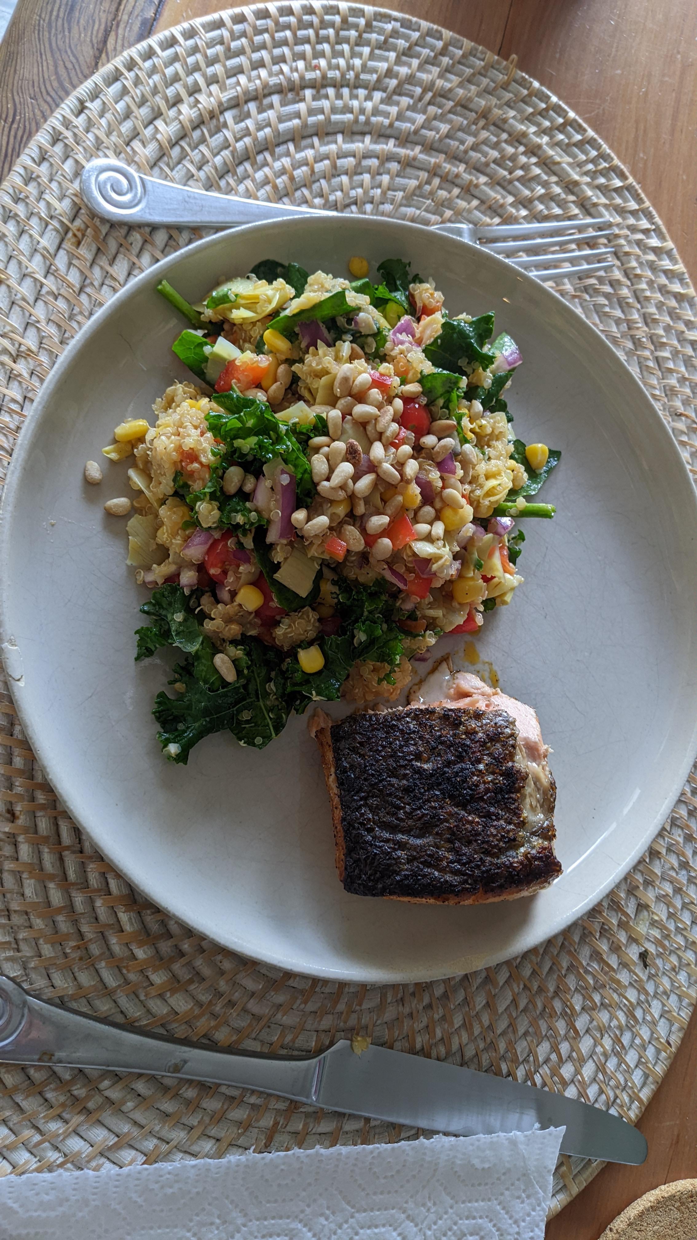 Salmon and quinoa salad (more veggies compared to quinoa) 500 cal