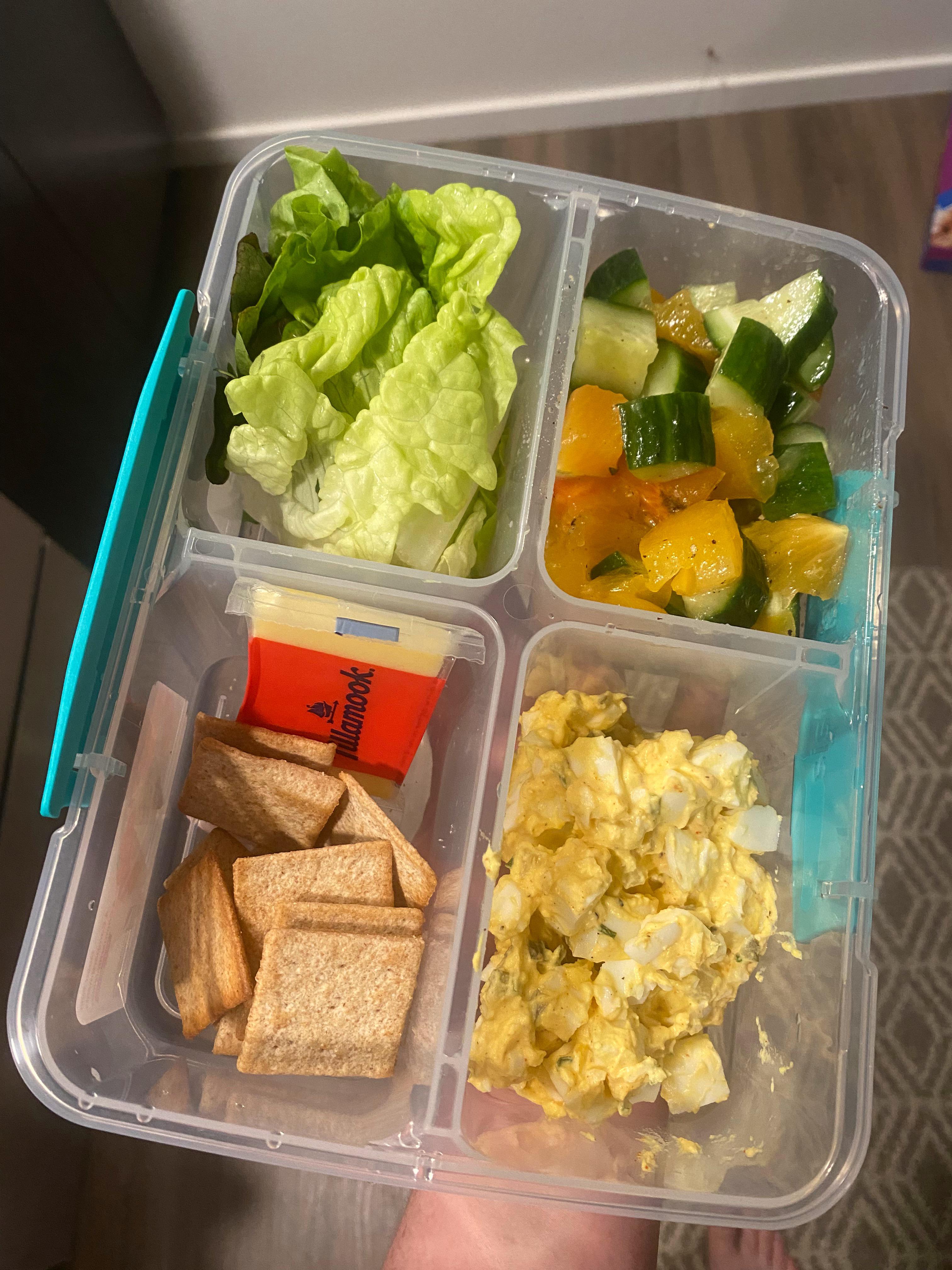 Lunch today. Egg salad, tomato & cucumber salad, lettuce to make a wrap for the egg salad, and some crackers and cheese! About 496cals. ☺️ Dining and Cooking